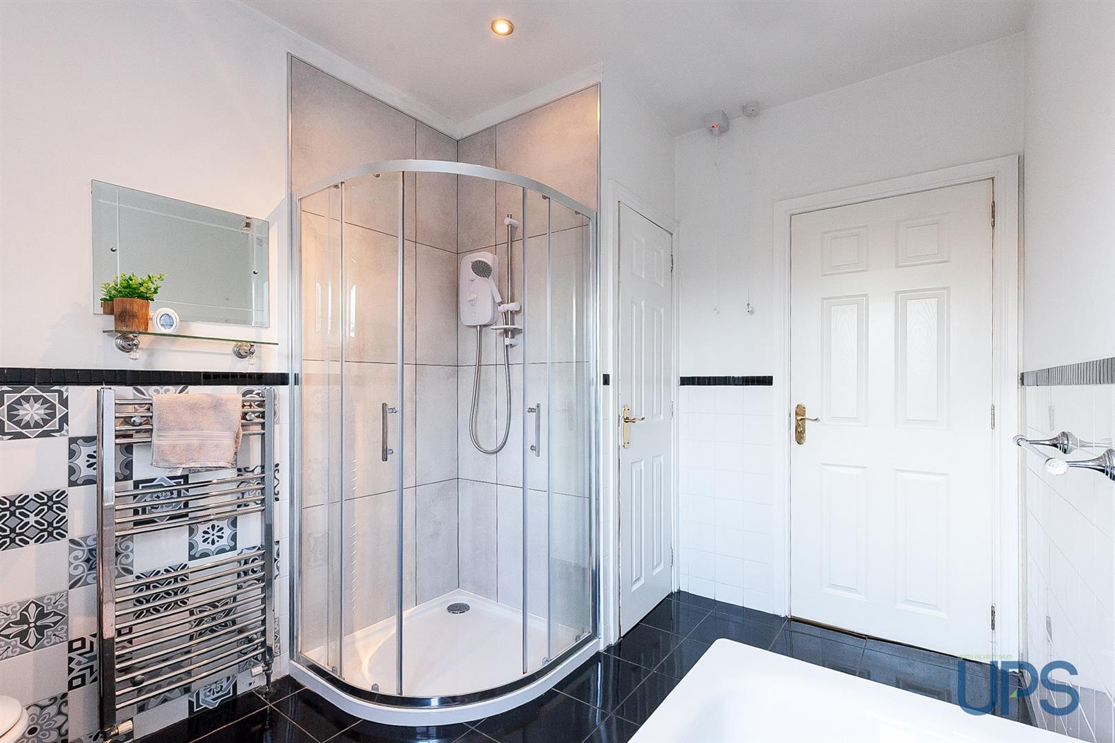 Bath, separate shower cubicle, low-flush W.C., pedestal wash hand basin, chrome-effect sanitary ware, chrome-effect towel warmer, spotlights, extractor fan, partially tiled walls, and tiled flooring.