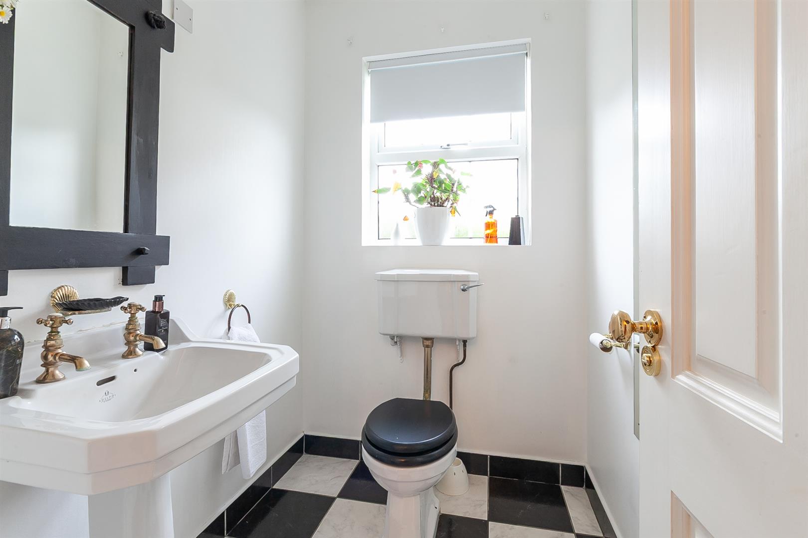 White, two piece suite comprising 'Adelphi' wash hand basin with separate hot and cold taps and white WC. Tiled floor with matching skirting.