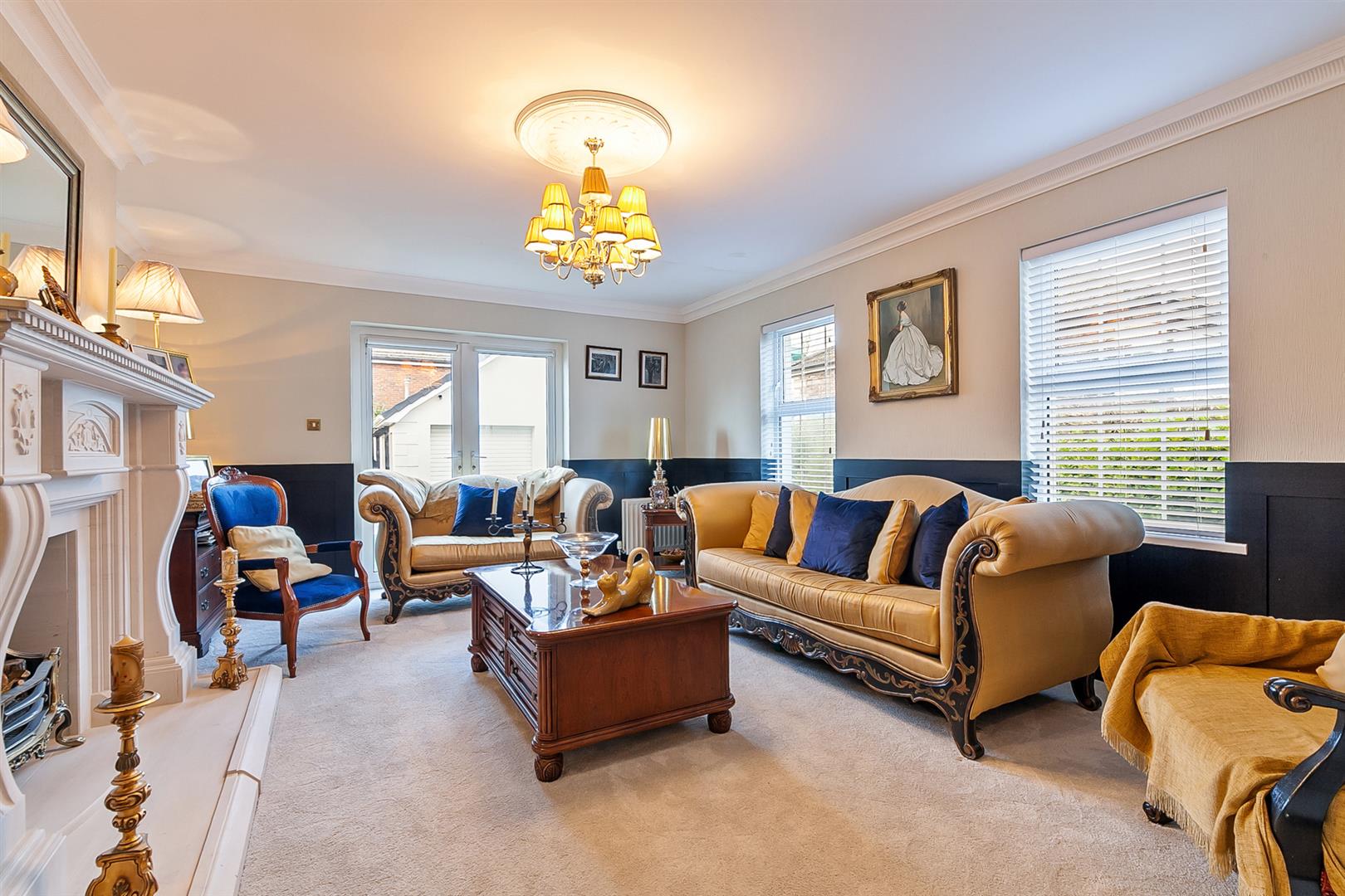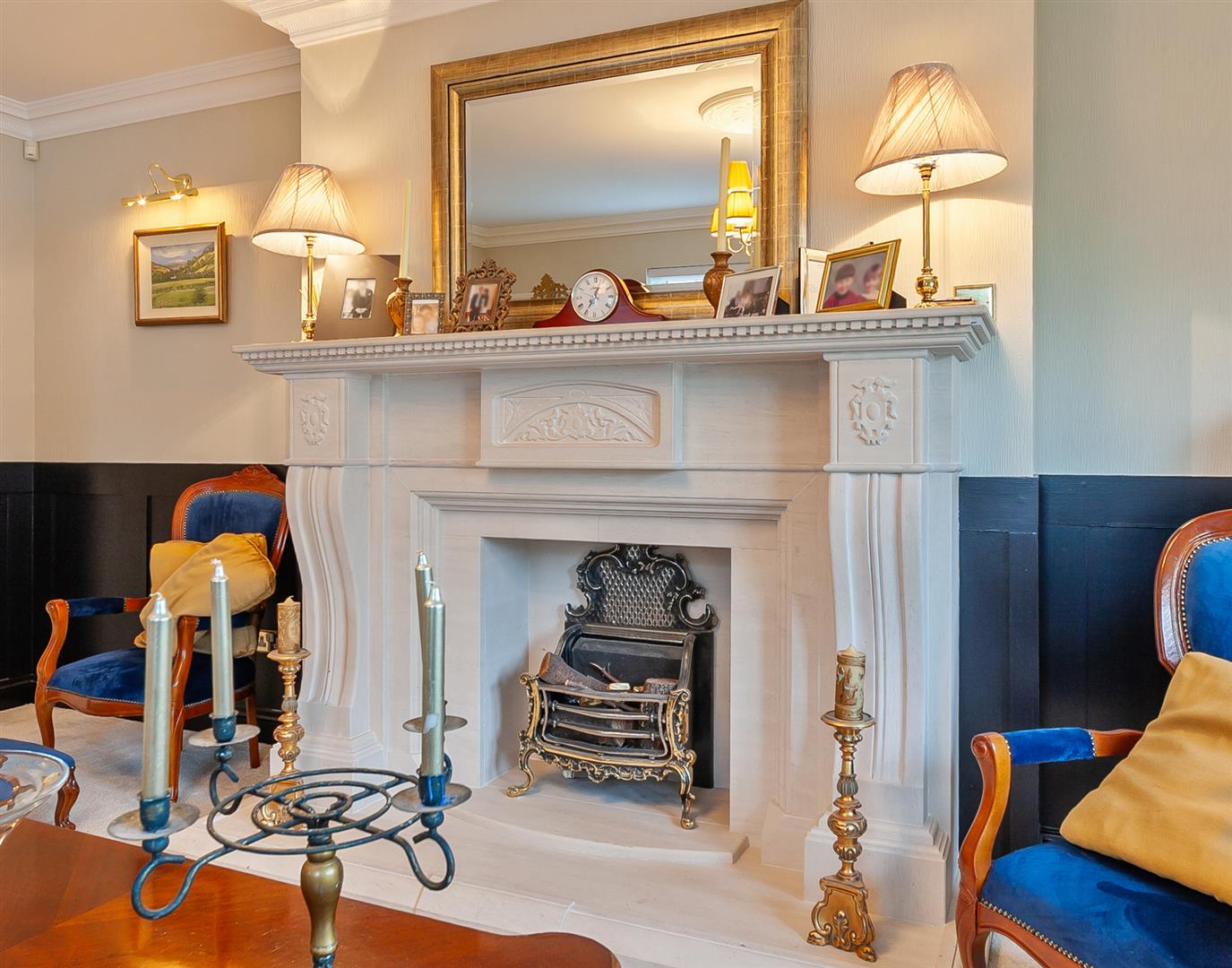 Focal point decorative limestone fireplace with matching hearth and surround. PVC double glazed French patio doors to rear garden. Part wood panelling to walls. Cornicing to ceiling. Ceiling rose.