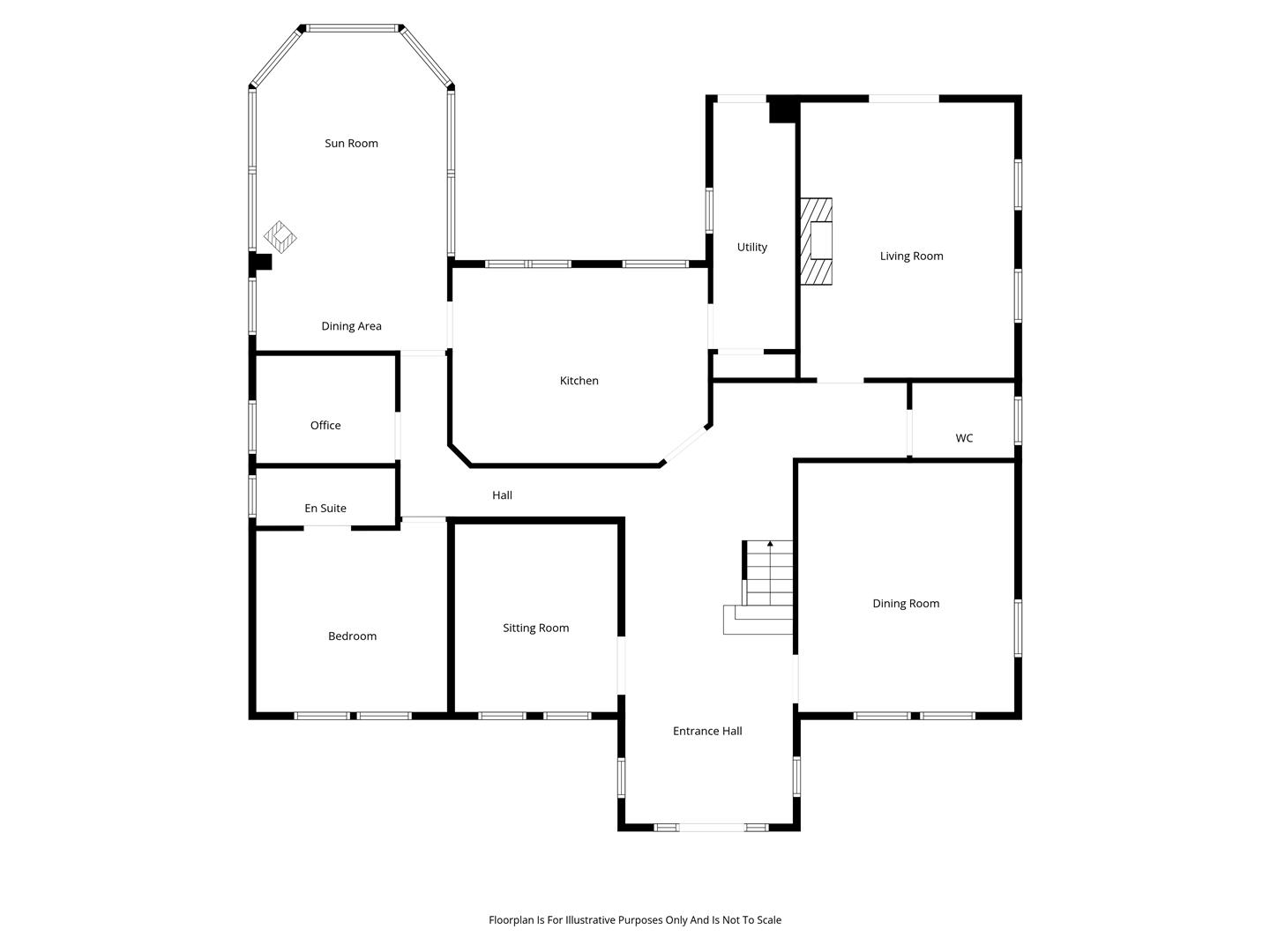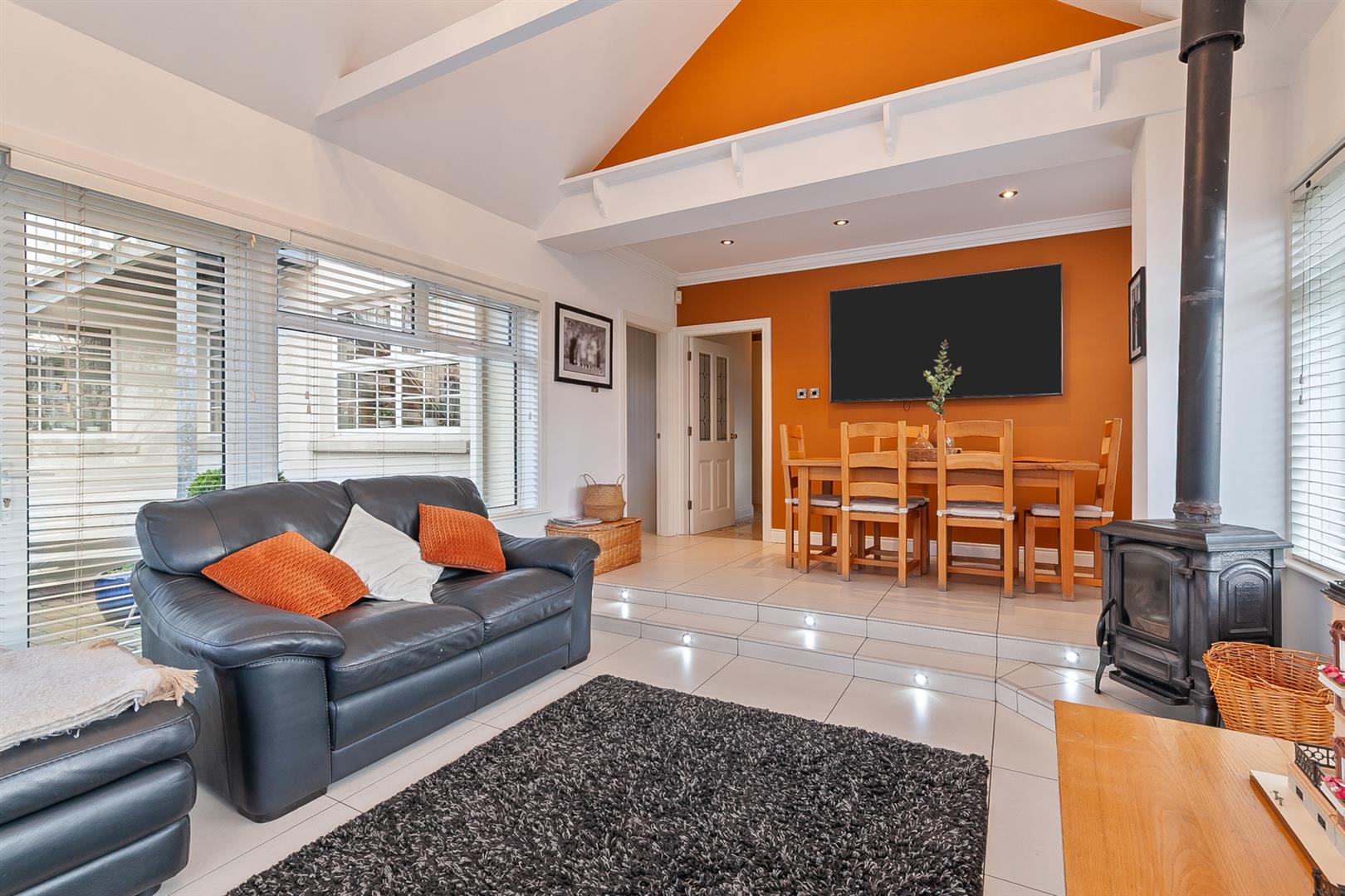 Split level sun lounge encompassing space for informal; dining. Tiled floor. Cast iron multi fuel burning stove. PVC double glazed windows with PVC double glazed French patio doors leading to rear garden. Light, power points and radiators.
