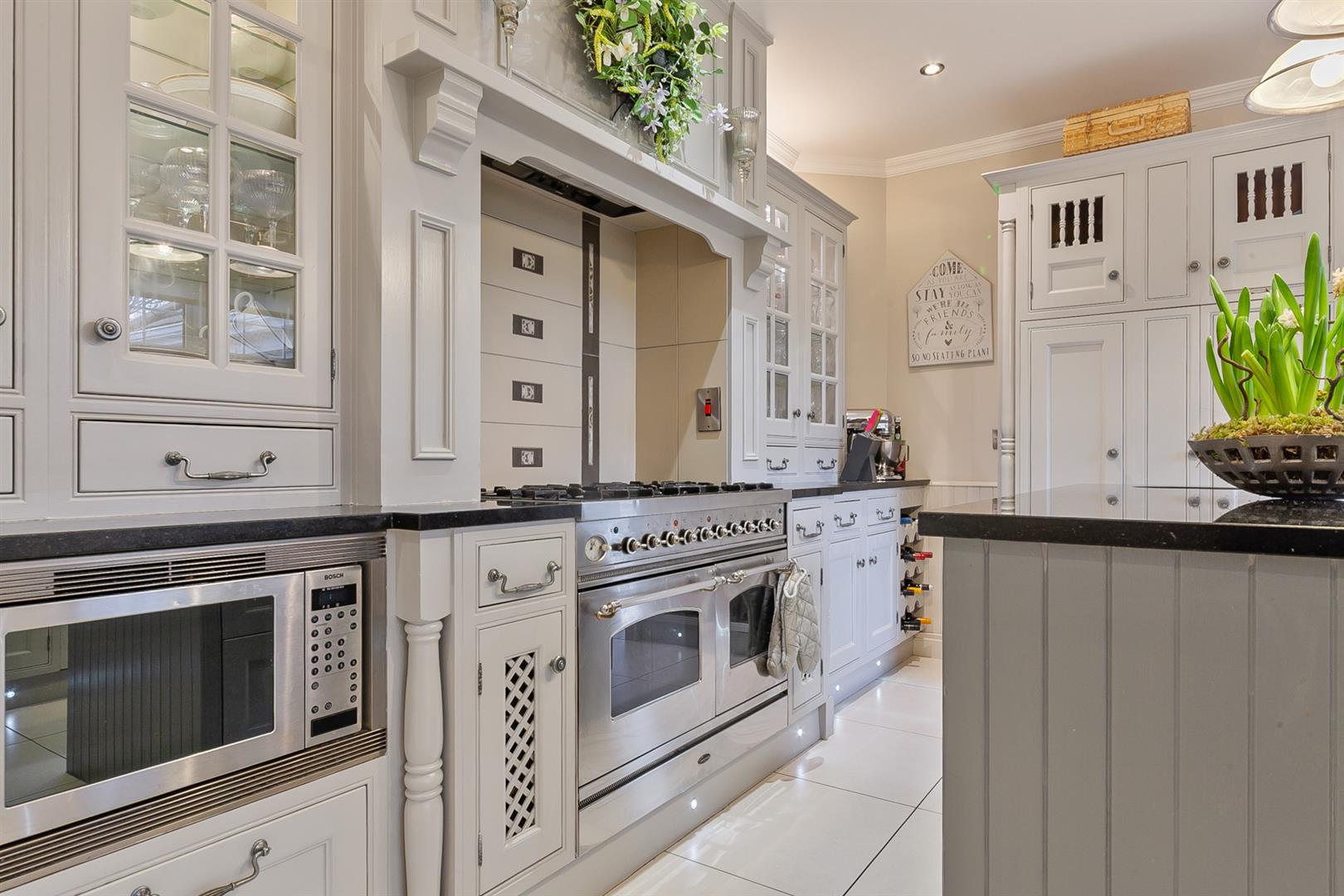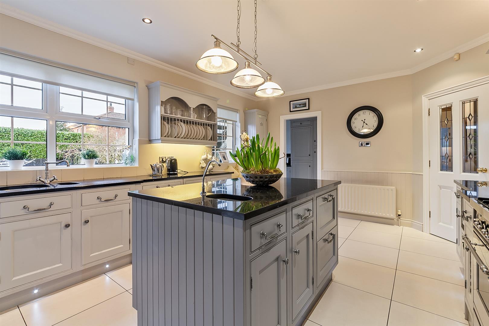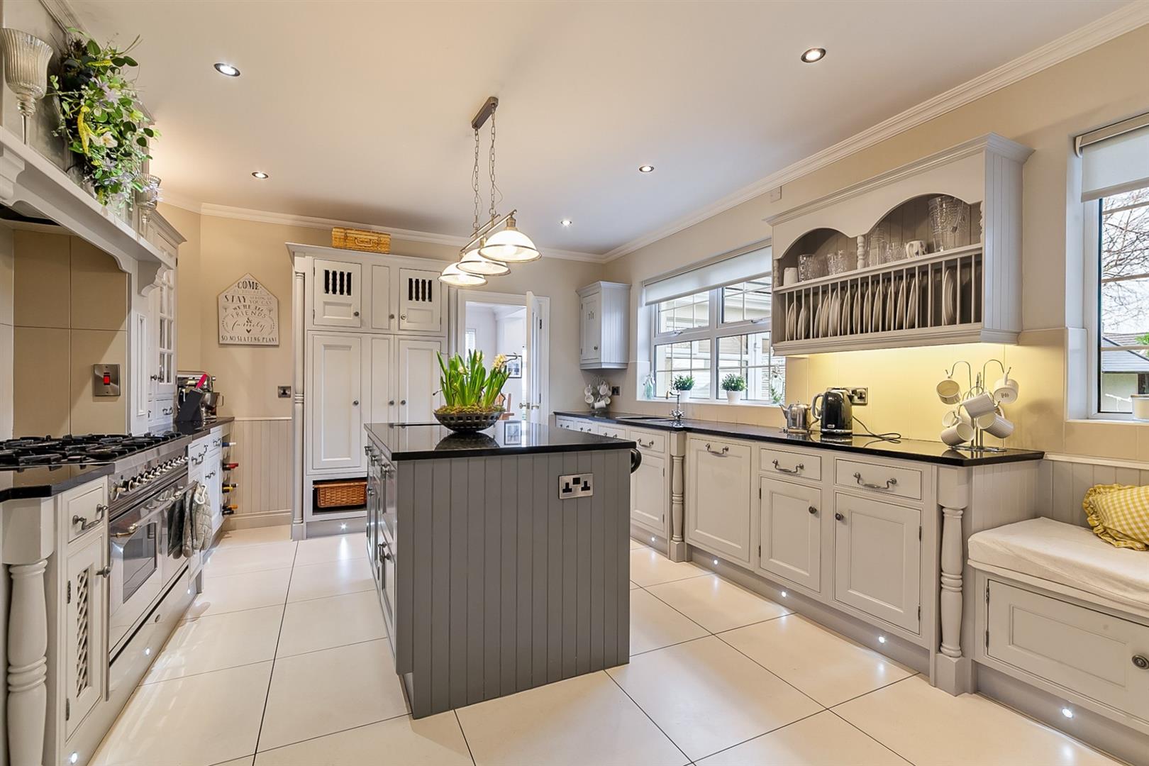 Luxury fitted kitchen with range of high and low level storage units with contrasting granite work surface and matching breakfast bar island. Inlaid stainless steel 1.5 bowl sink unit with mixer tap over. Space for range cooker with six ring gas hob and extractor hood over. Integrated fridge unit. Integrated dishwasher. Part tiling to walls. Tiled splashback to walls and over hob. LED lighting inset to kickboards. Tiled floor. Cornicing to ceiling. Part wood panelling to walls.
