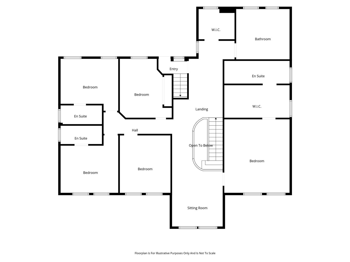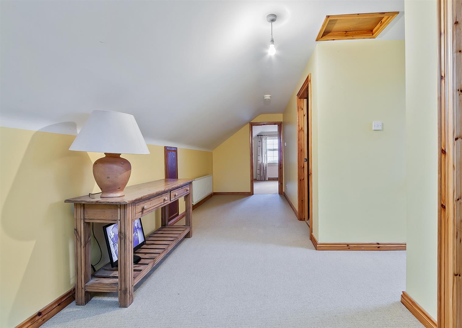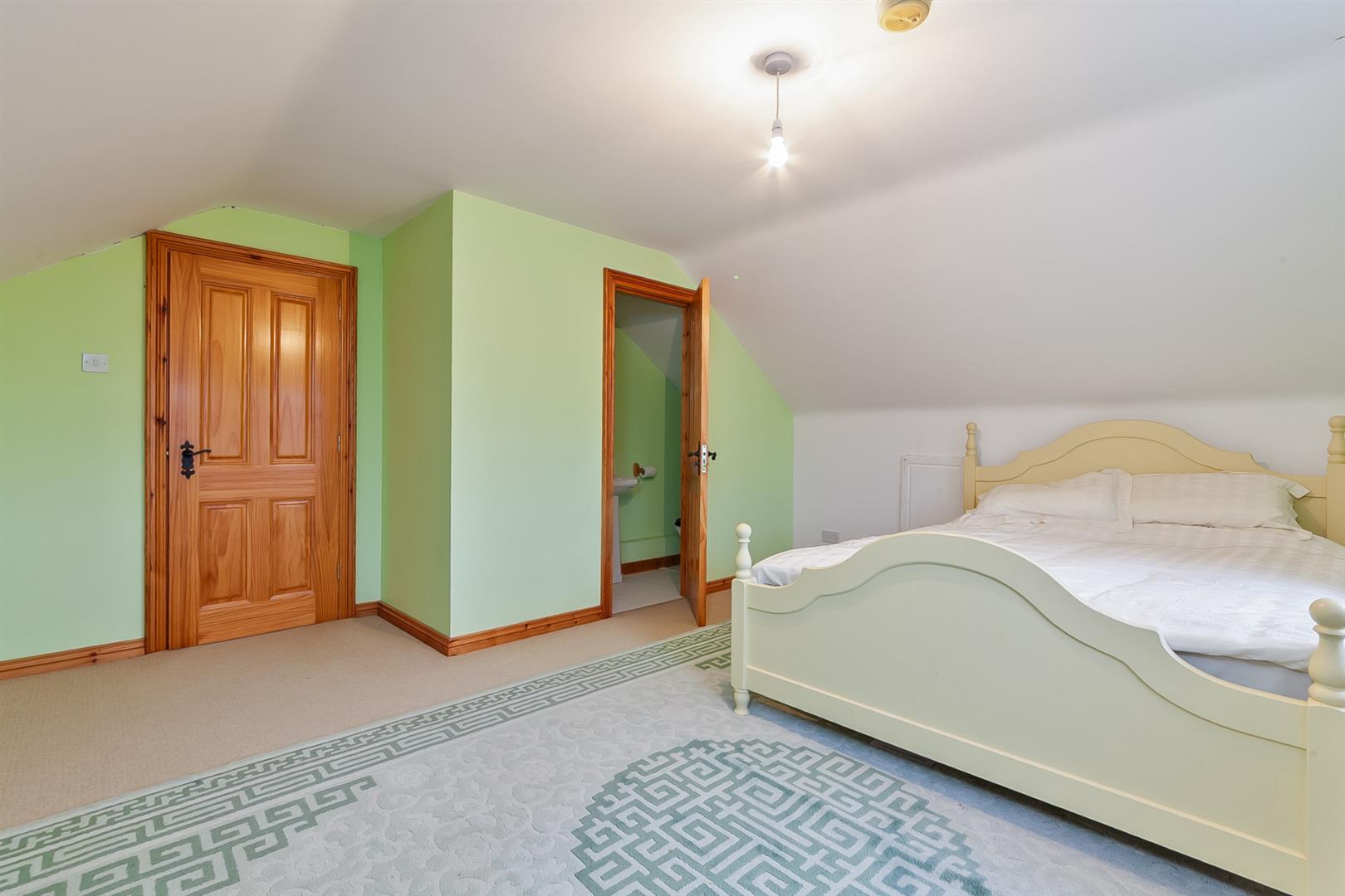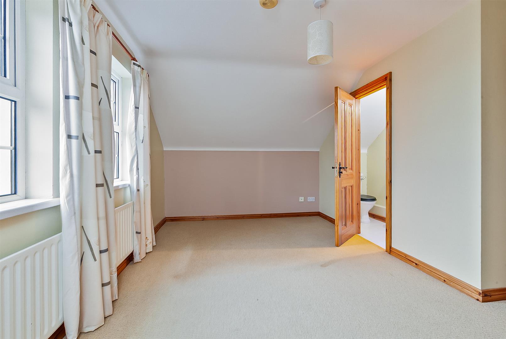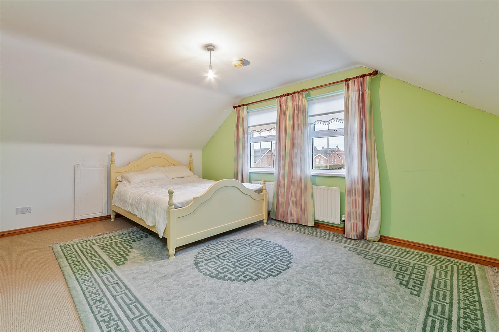 Recess for study/informal sitting area. Twin windows to front elevation. Cornicing and spotlights to ceiling. Access to fixed stairwell leading to second floor. Walk in shelved hot press with light and PVC double glazed window.