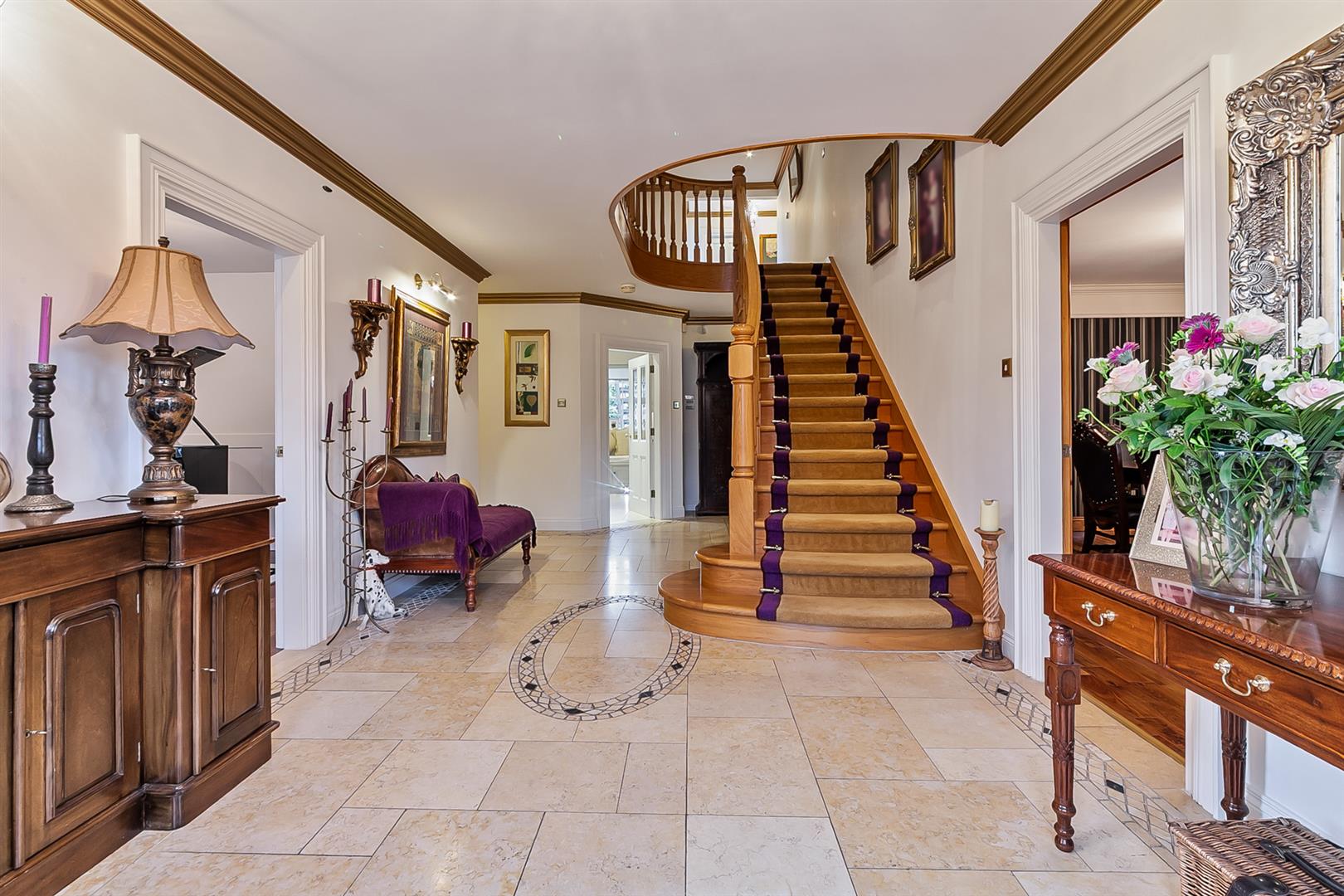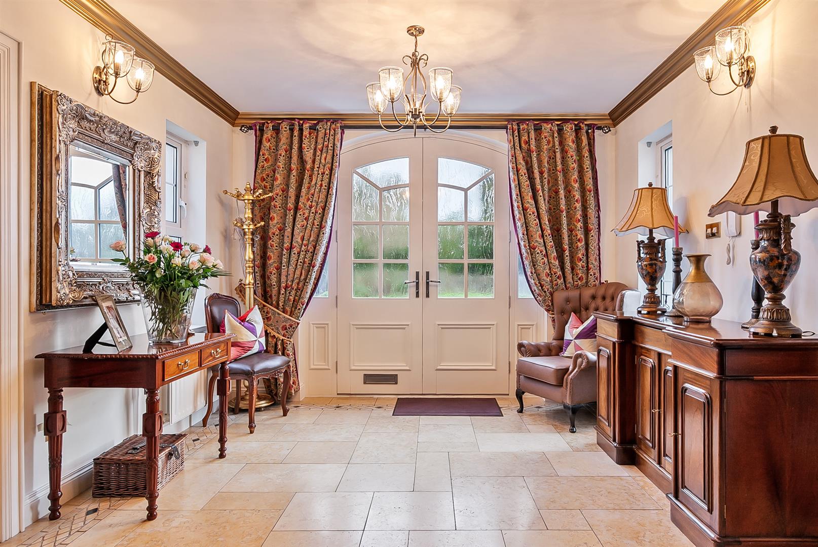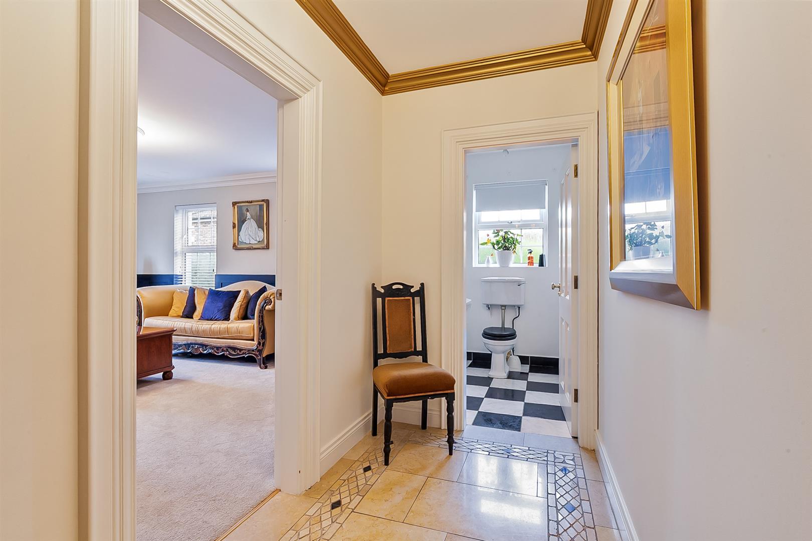 Hardwood, glazed, panelled double doors with matching double glazed side panels. Dual aspect windows. Tiled flooring. Oak stairwell with matching handrail and balustrade. Alarm panel. Intercom gate entry handset. Cornicing to ceiling. Beam vacuum points.