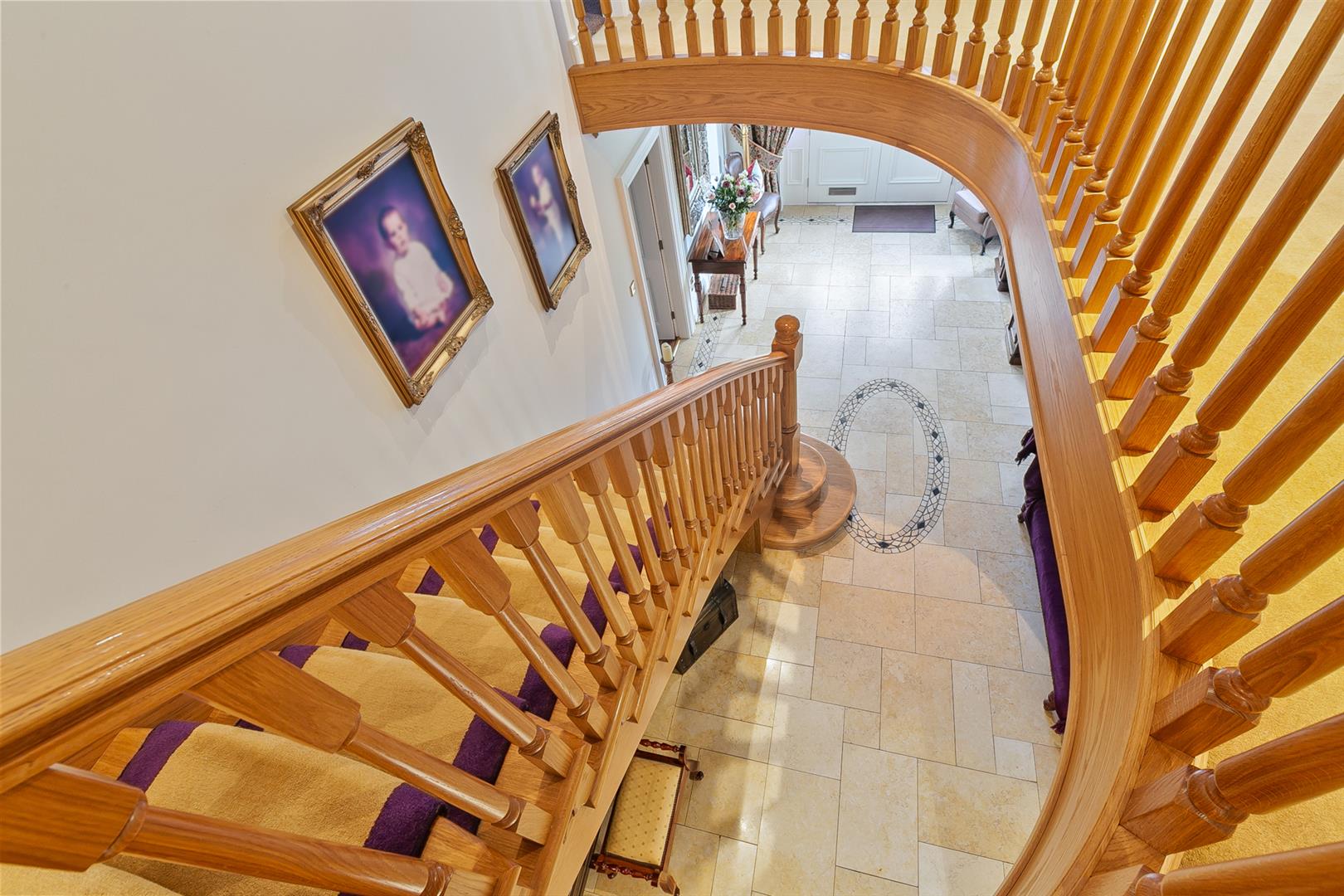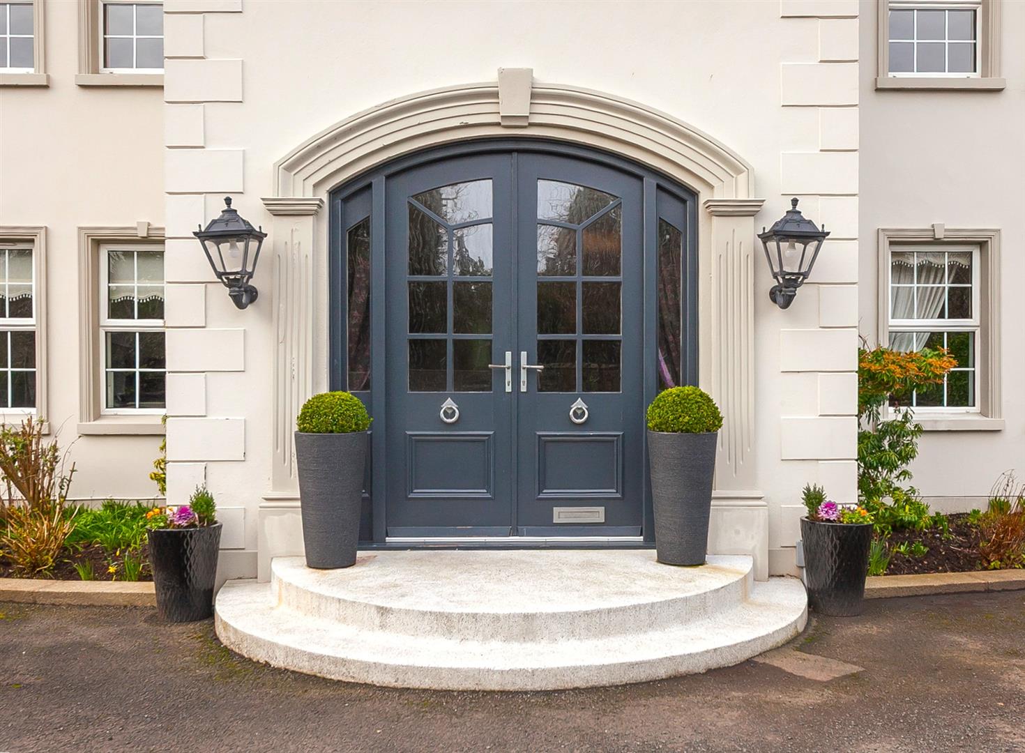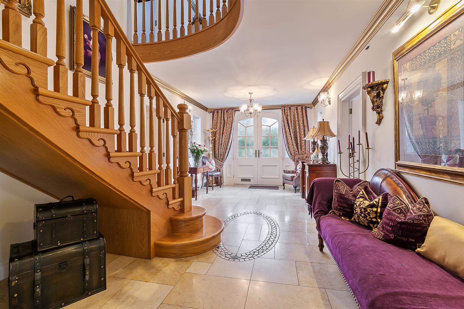 Hardwood, glazed, panelled double doors with matching double glazed side panels. Dual aspect windows. Tiled flooring. Oak stairwell with matching handrail and balustrade. Alarm panel. Intercom gate entry handset. Cornicing to ceiling. Beam vacuum points.