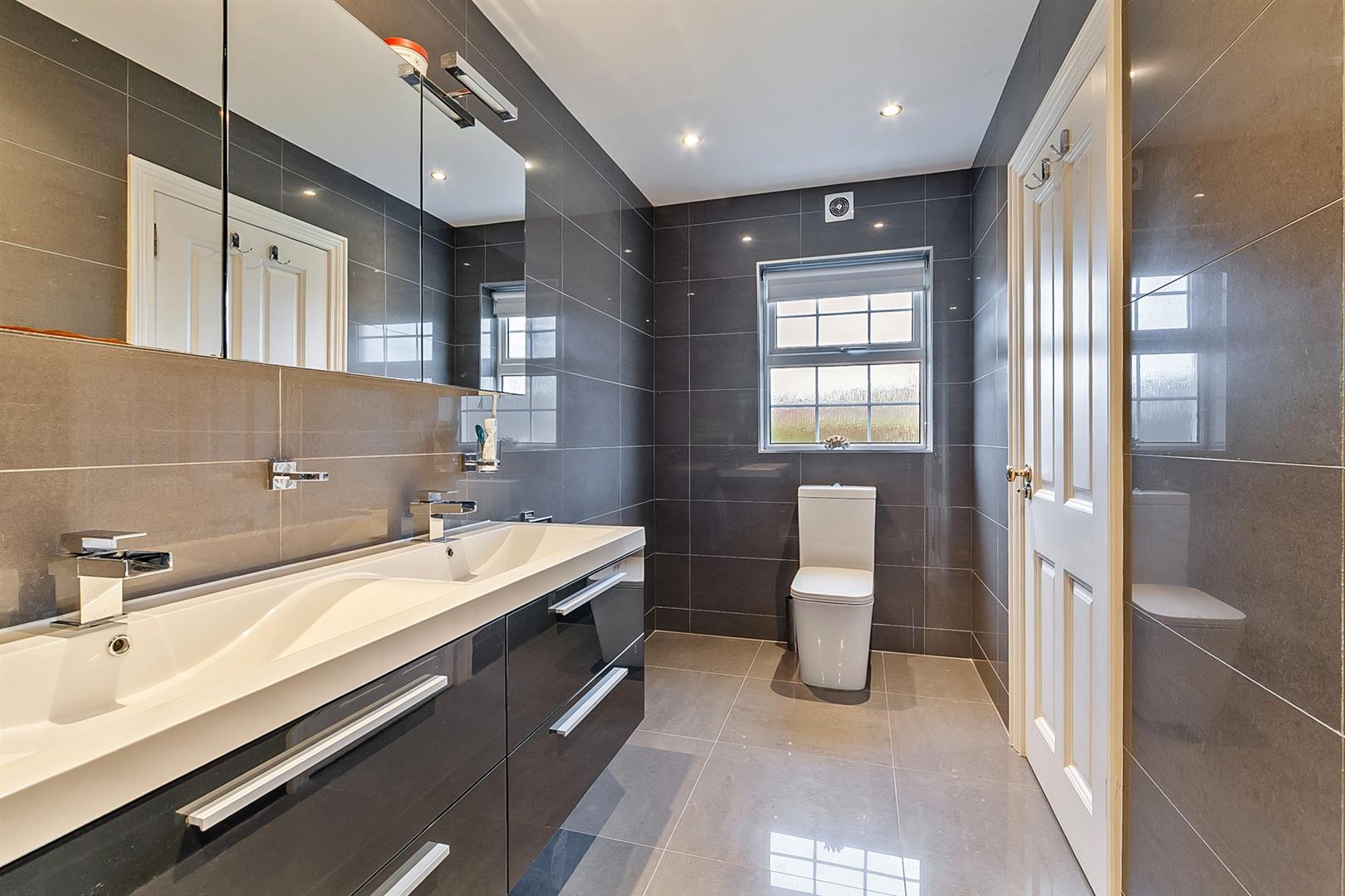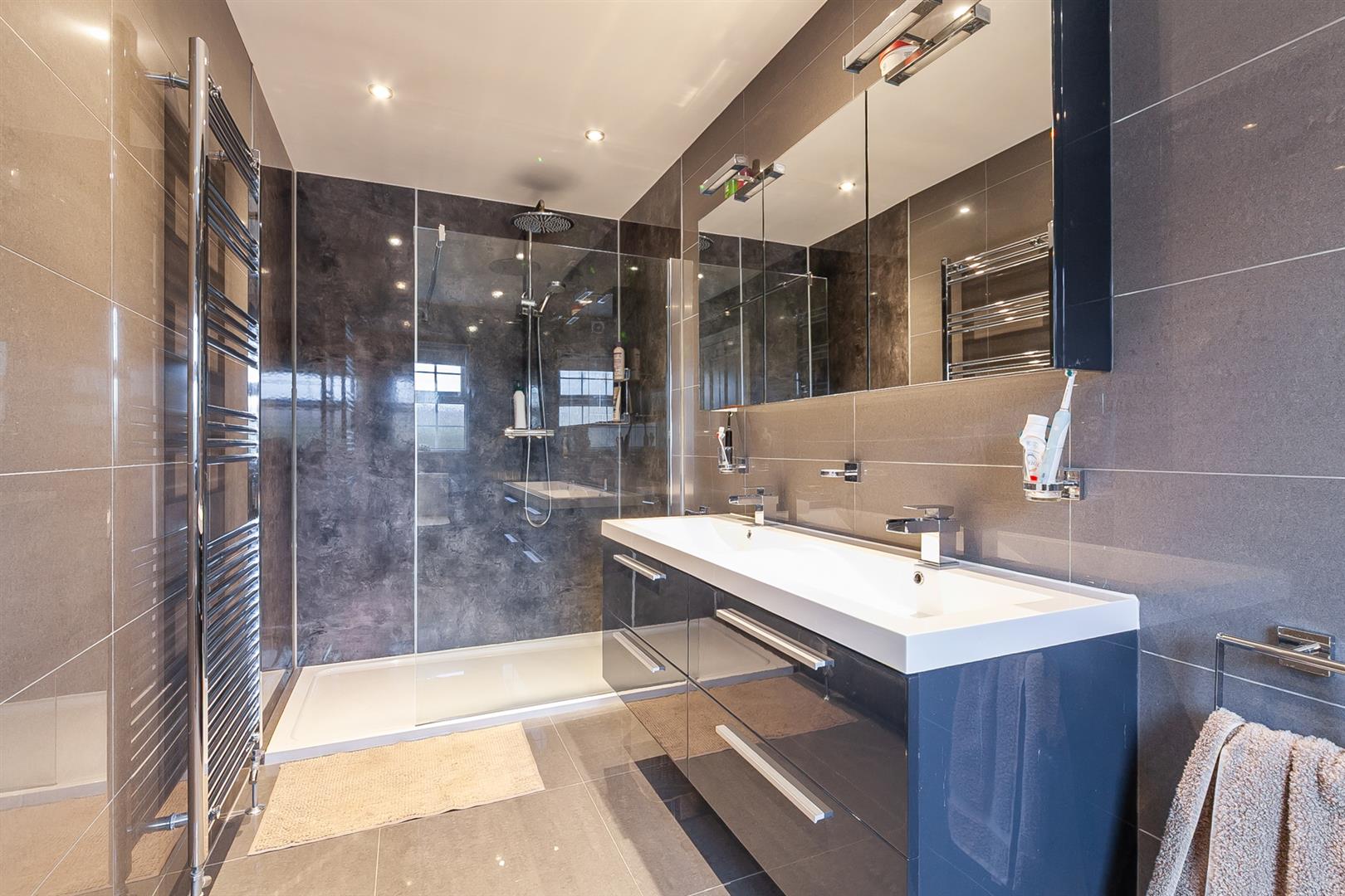 Contemporary, four piece suite comprising oversized fully panelled shower enclosure with drying area, vanity unit with twin wash hand basins and waterfall taps over, and WC. Thermostat controlled shower unit with drench shower head over and separate shower attachment. Tiled walls. Tiled floor. Spotlights to ceiling. Chrome towel radiator.