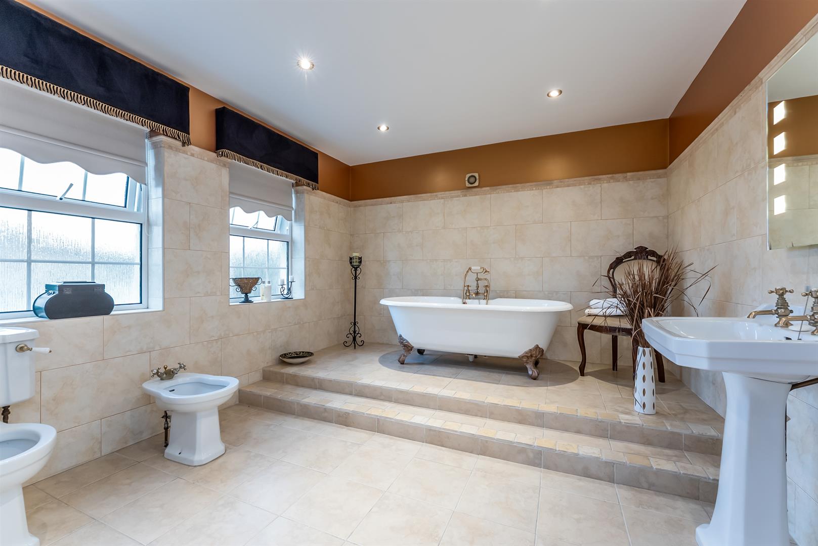White, four piece suite comprising freestanding claw foot bath with telephone handle shower attachment and mixer tap over, 'Adelphi' pedestal wash hand basin, 'Adelphi' bidet, and WC. Part tiling to walls. Tiled floor. PVC double glazed frosted windows to rear elevation. Spotlights to ceiling.