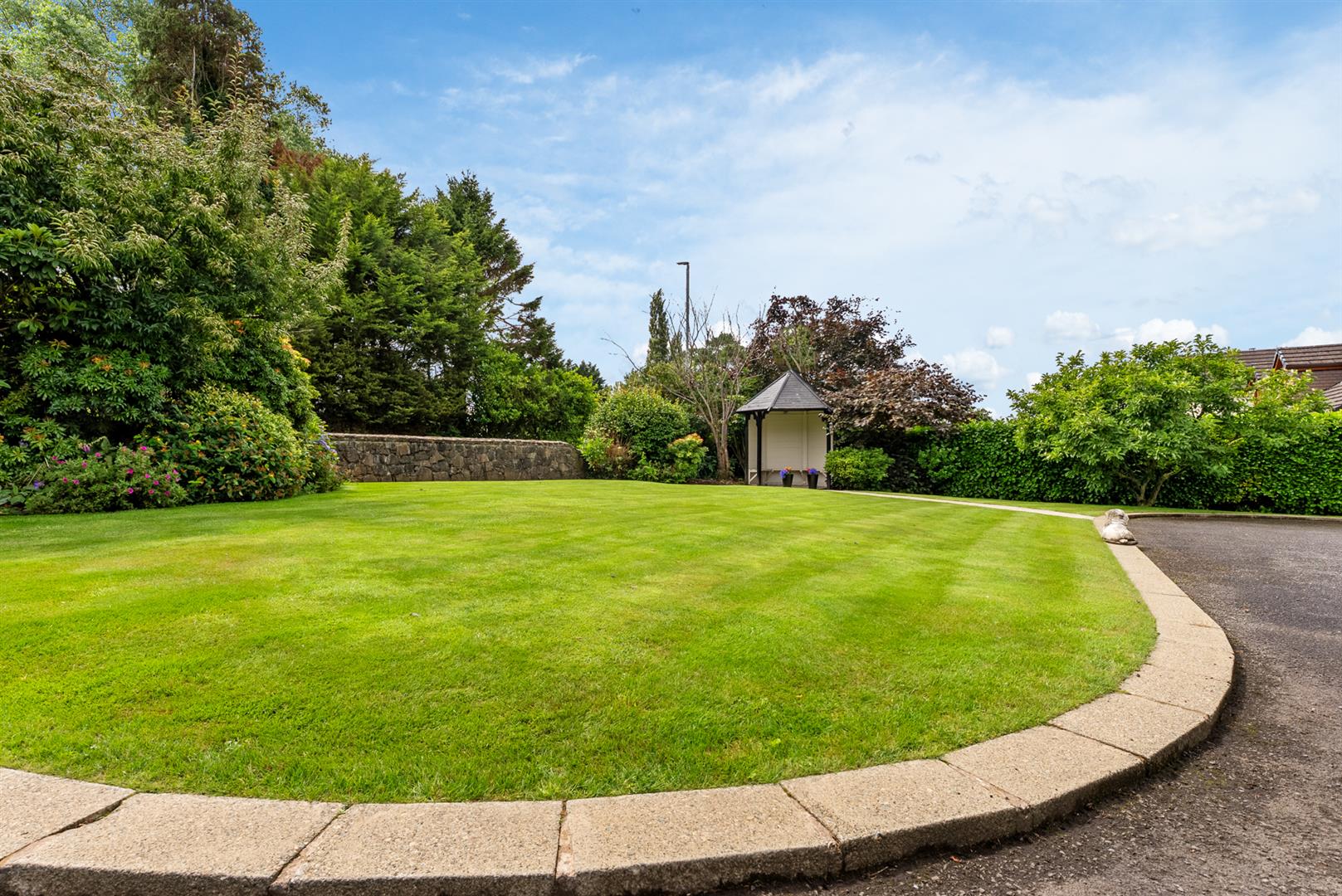 Front garden finished in lawn with feature stone wall, range of plants, trees, and shrubbery, and timber 'summer house'.
