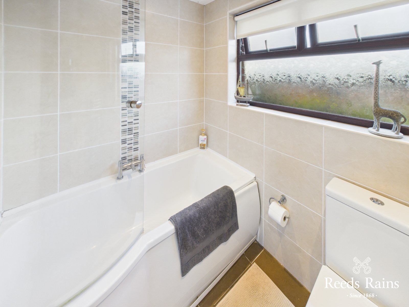 Modern three piece bathroom suite comprising panel bath, low flush WC and wash hand basin. Complete with tiled walls and tiled flooring. Chrome heated Towel rail.