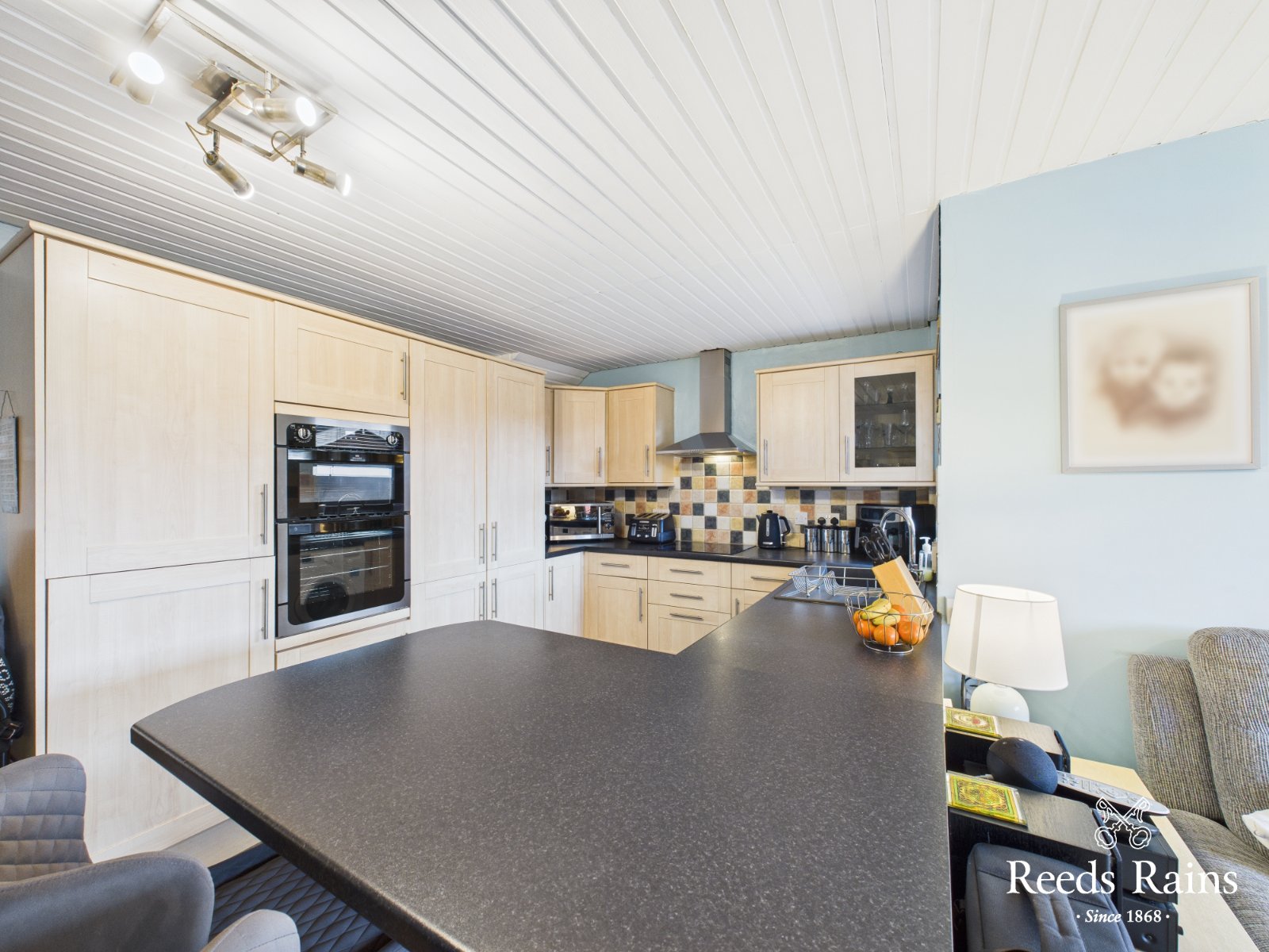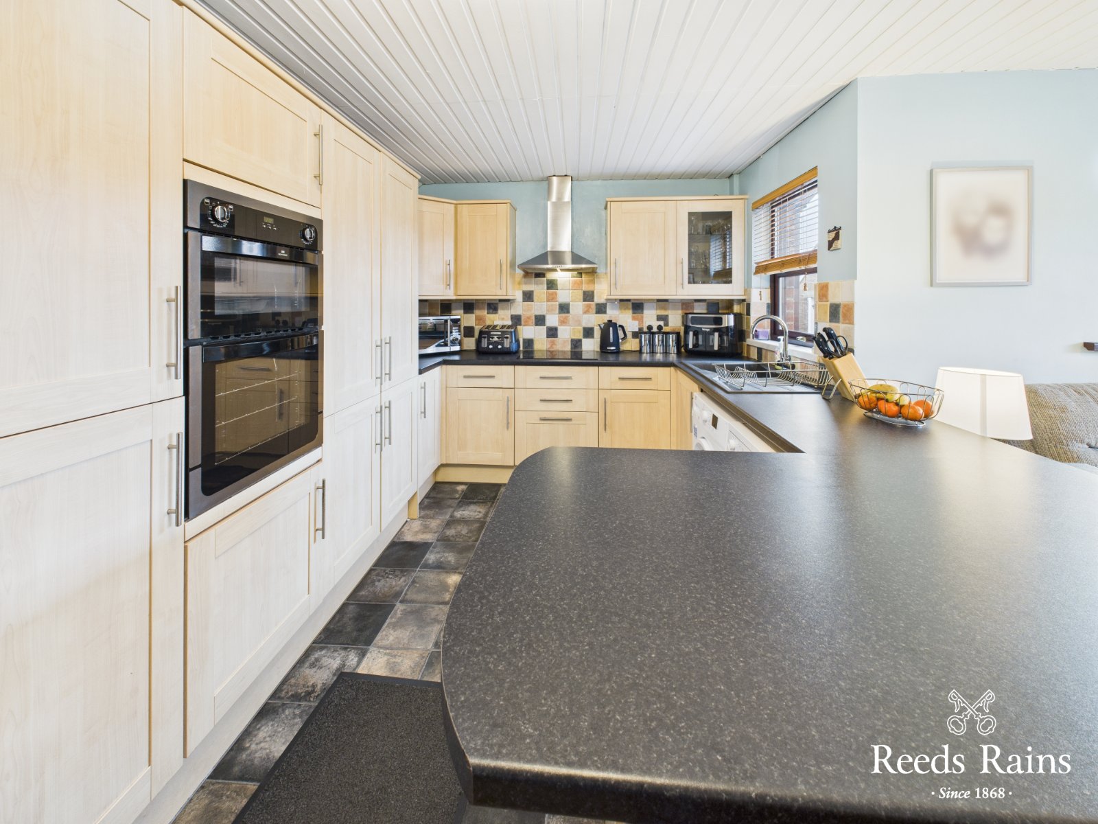 Range of high and low level units with matching worktop and breakfast bar. Built in twin oven and touch point hob with extractor fan overhead. Integrated appliances and plumbed for white goods. Tiled floor and tiled splashback areas. Ample casual dining space