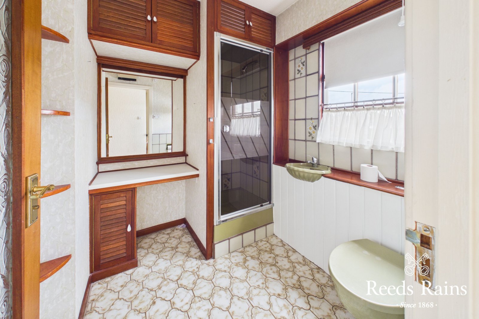 Three piece Avocado shower suite offering walk in shower cubicle, dual flush WC and wash hand basin. Tiled flooring and splashback areas.