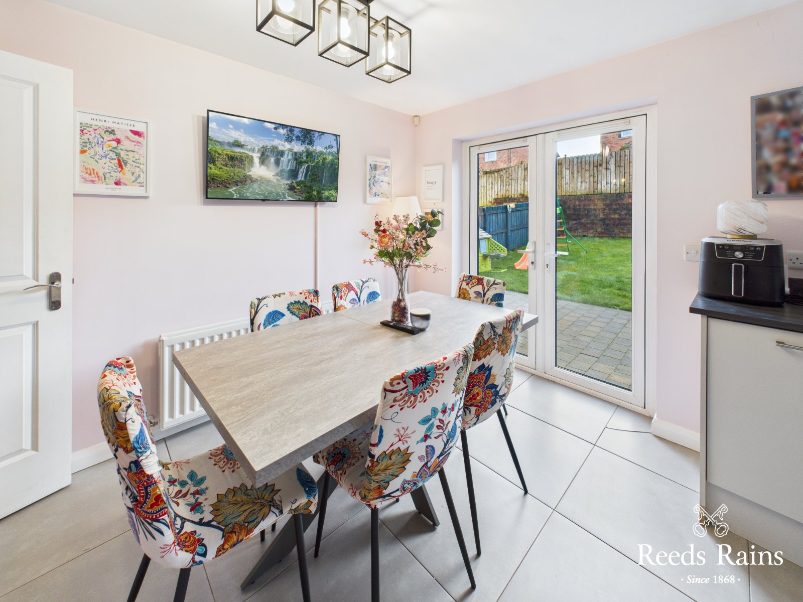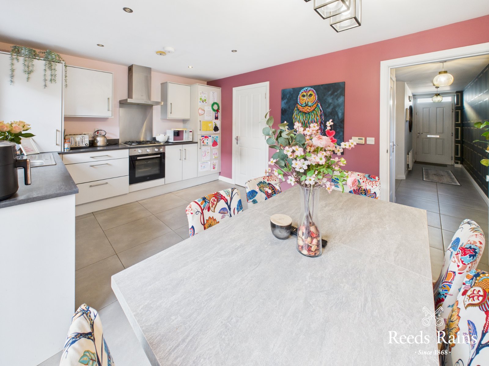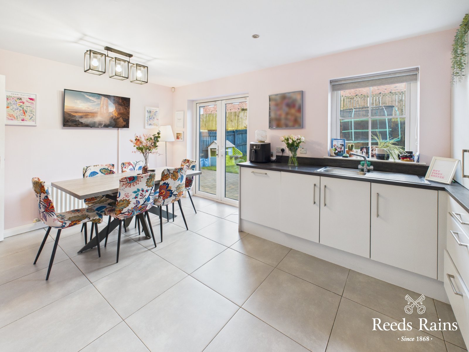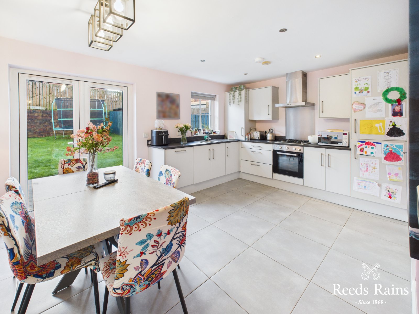 Excellent range of high and low level units with matching marble effect work surfaces. One and half bowl stainless steel drainer unit and sink. Built in oven and hob with extractor fan. Integrated appliances and plumbed for white goods. Tiled splashback areas. Recessed spotlights. Ample casual dining space with double doors to rear garden. Complete with tiled flooring.