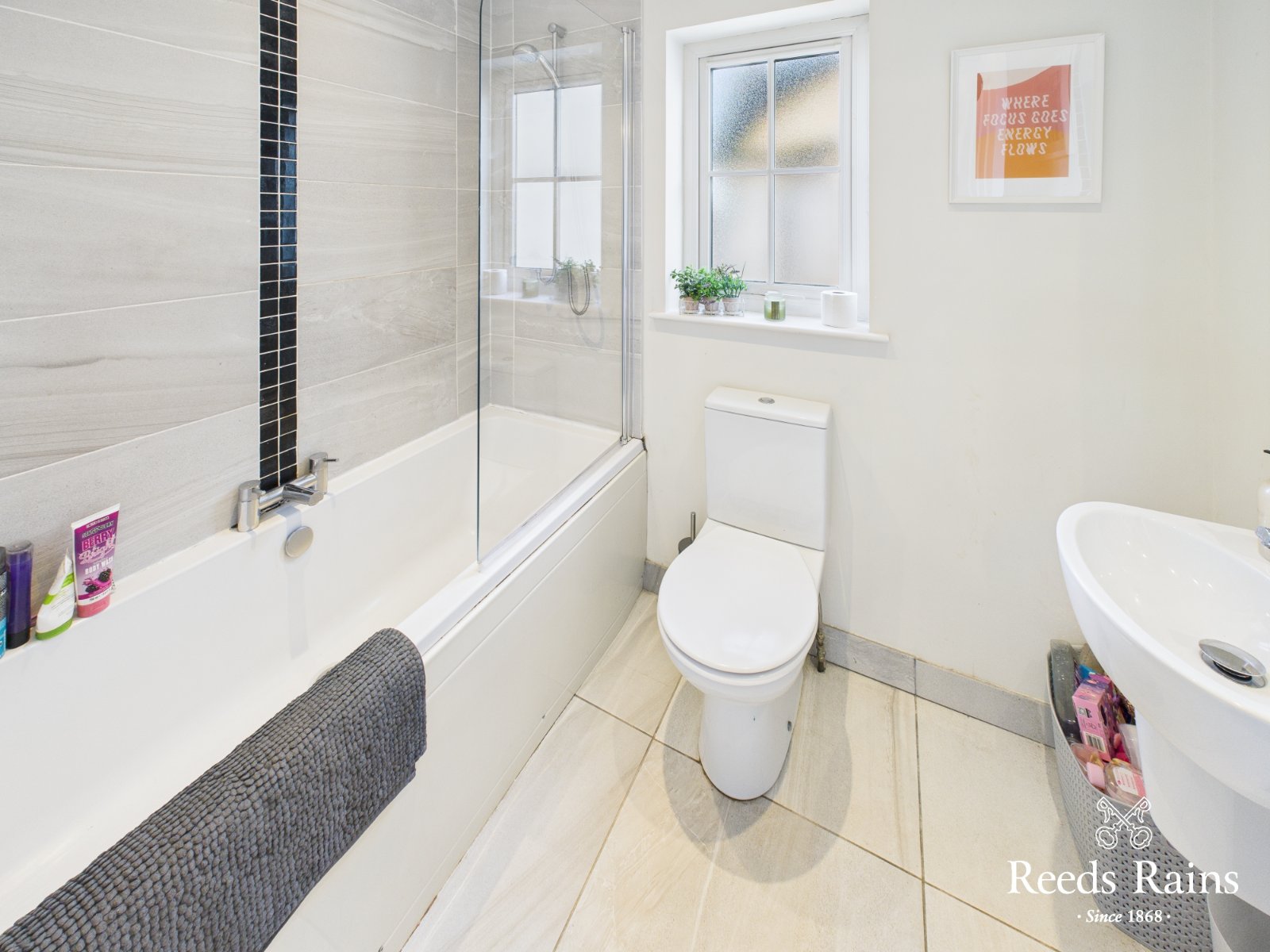 A modern and stylish bathroom suite comprising panelled bath. Pedestal wash hand basin. Dual flush WC. Tiled floor. Complementary wall tiling. Chrome heated towel rail. Extractor fan.