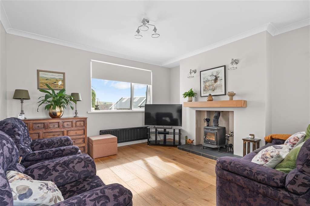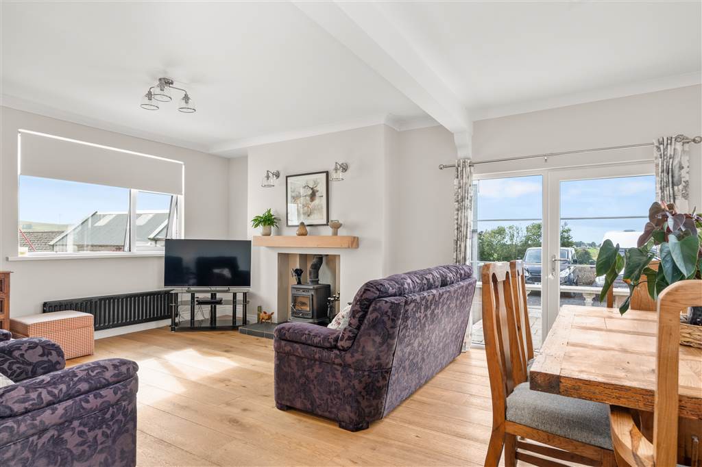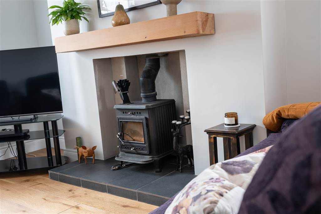 With multi-fuel burning stove to tiled hearth and wooden mantle. Wall lights. Coving to ceiling. PVC glazed door to side of property. Wooden flooring.