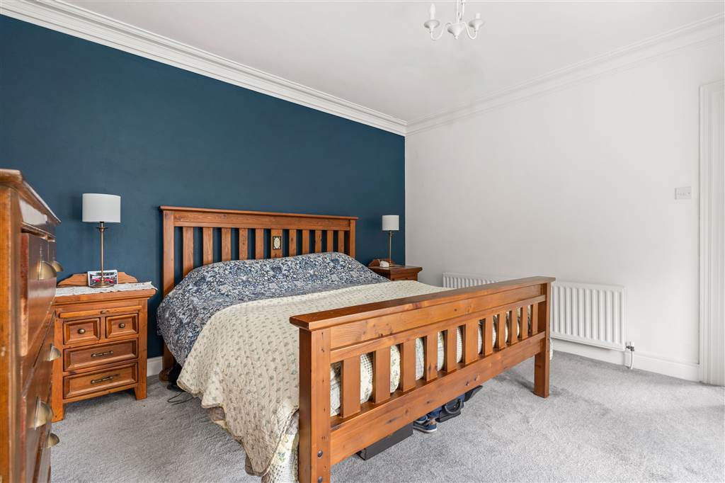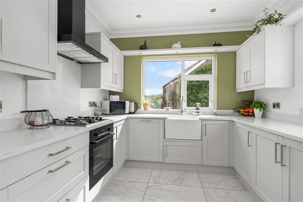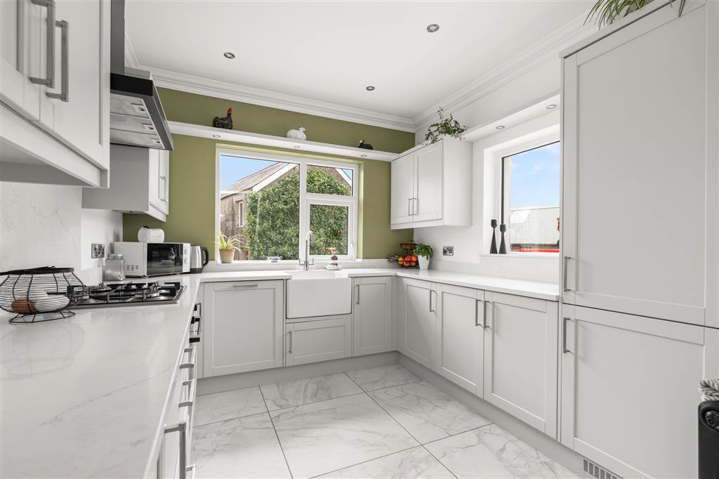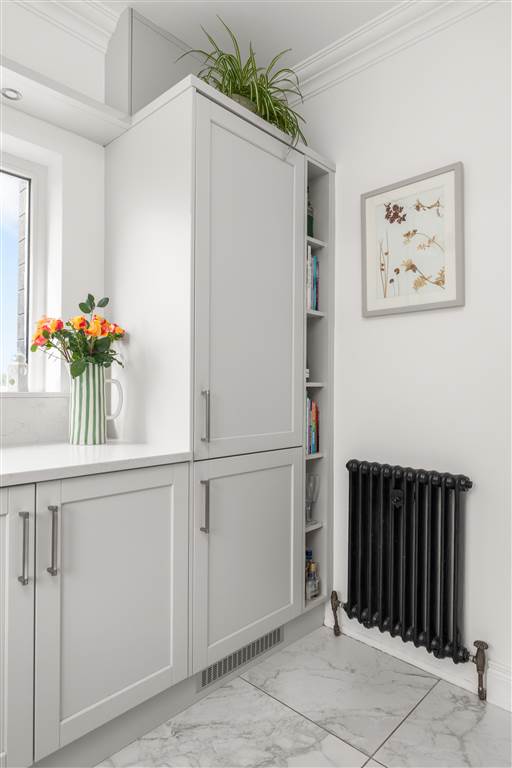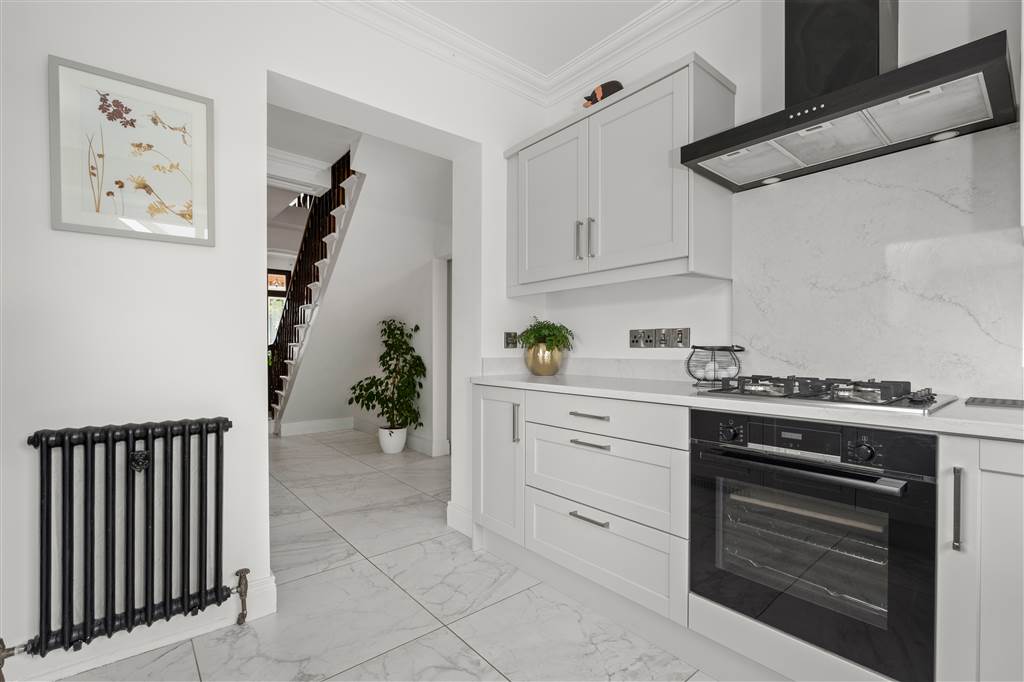 With a range of eye and low-level fitted light gray shaker style units with Sinquastone worktop, Belfast sink with Sinquastone drainer and stainless-steel mixer tap. Integrated gas hob with extractor fan over. Integrated electric oven. Integrated dishwasher. Integrated full length fridge. Cutlery drawer. Saucepan drawers. Be-spoke built-in wine rack/shelving. Traditional cast-iron radiator. Spot lighting to ceiling. Coving to ceiling. Tiled flooring.