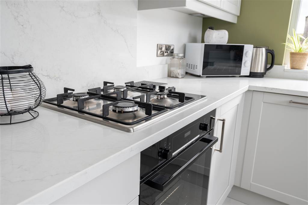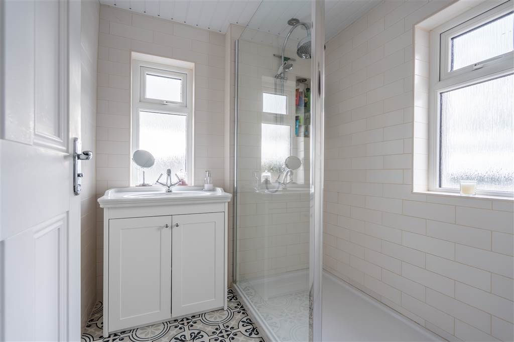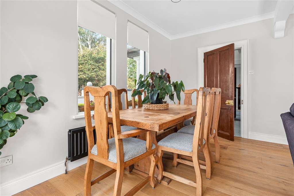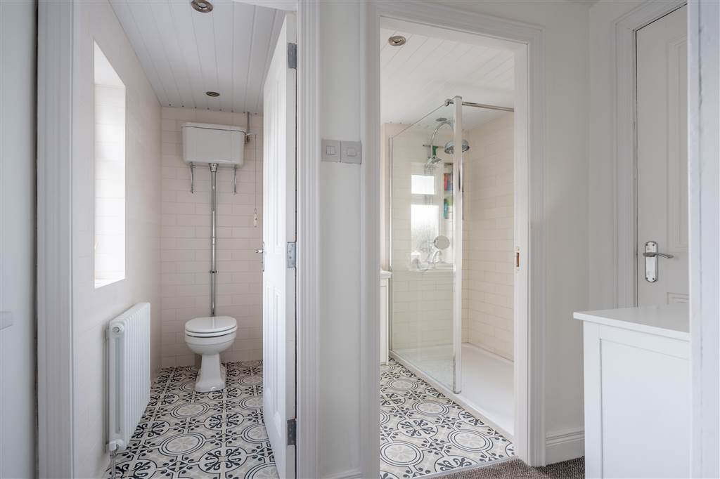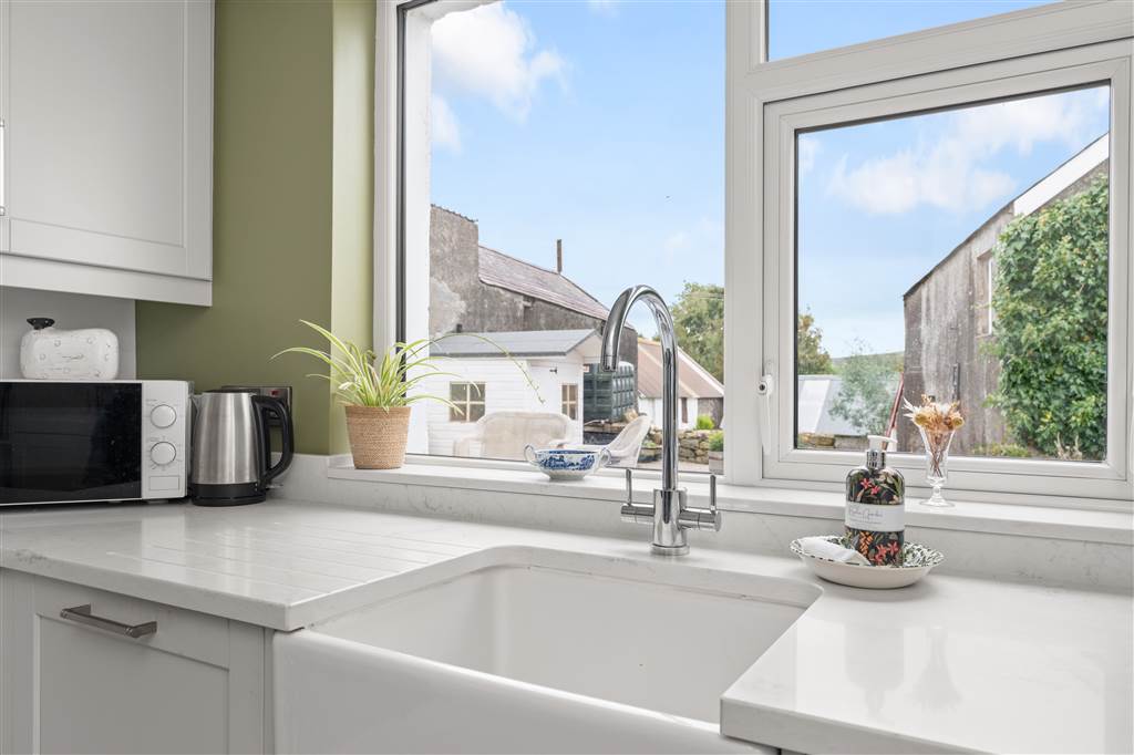 With a range of eye and low-level fitted light gray shaker style units with Sinquastone worktop, Belfast sink with Sinquastone drainer and stainless-steel mixer tap. Integrated gas hob with extractor fan over. Integrated electric oven. Integrated dishwasher. Integrated full length fridge. Cutlery drawer. Saucepan drawers. Be-spoke built-in wine rack/shelving. Traditional cast-iron radiator. Spot lighting to ceiling. Coving to ceiling. Tiled flooring.
