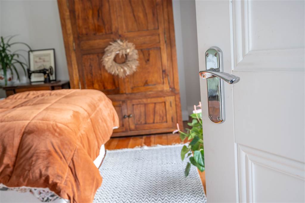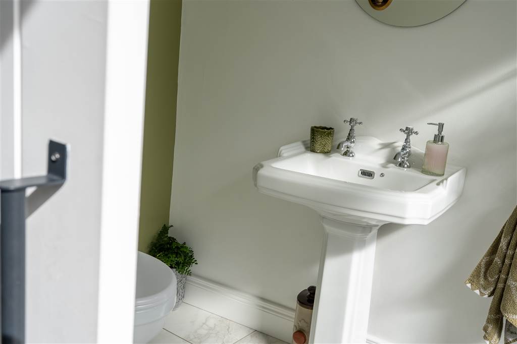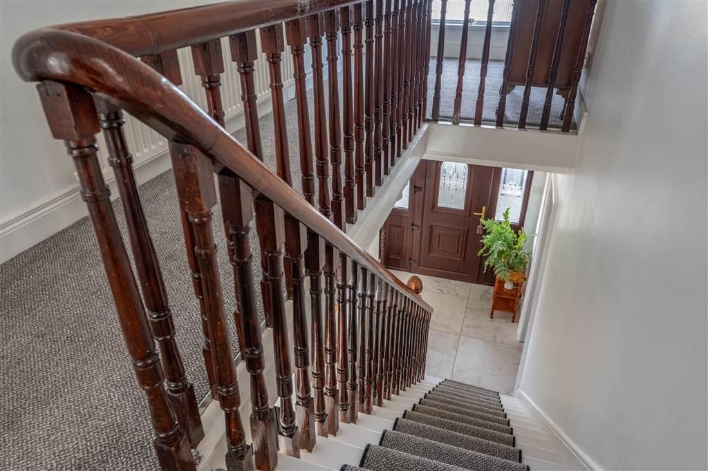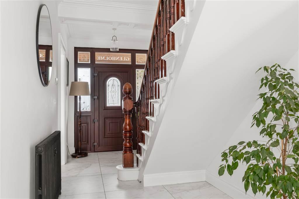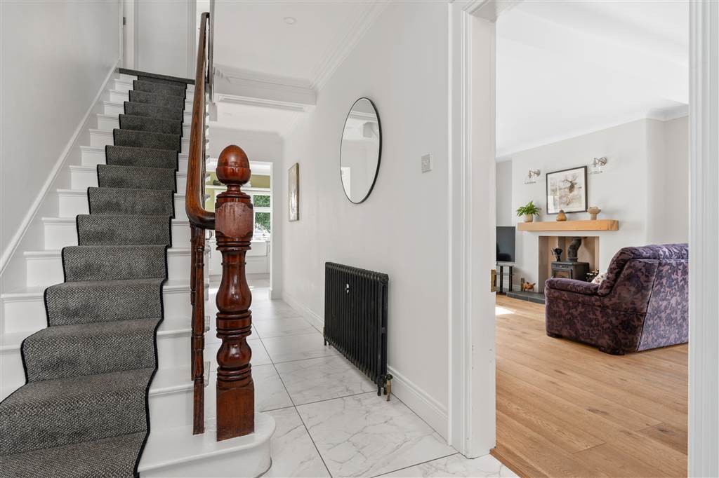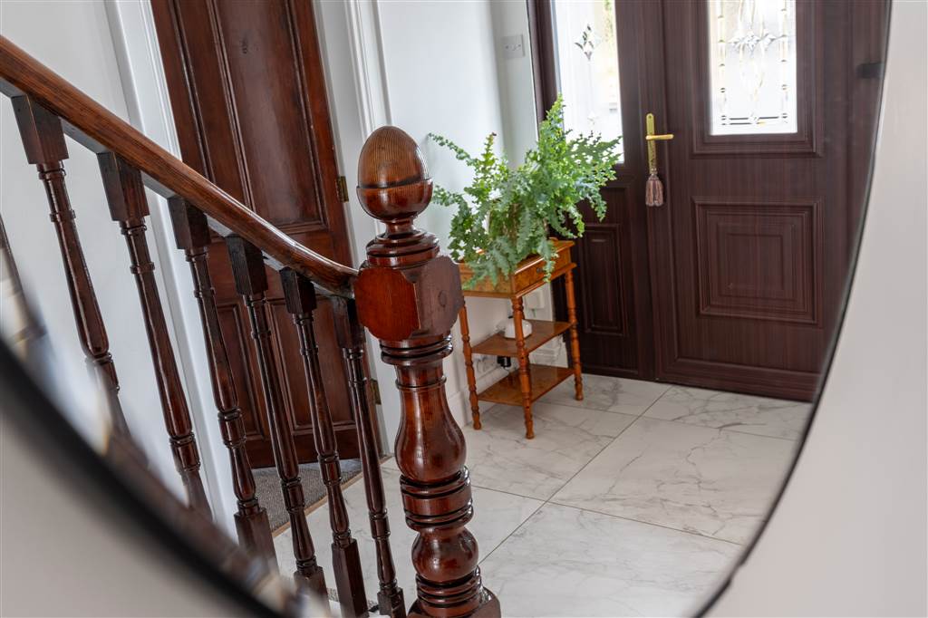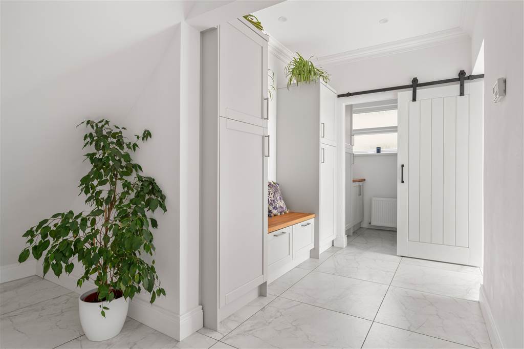 With PVC front door with decorative glazed pane and decorative glazed surround. Balustrade staircase to first floor. Traditional cast-iron radiator. Boot room with built-in storage. Glazed PVC door to rear. Traditional cast-iron radiator at rear door. Coving to ceiling. Spot lighting to ceiling. Tiled flooring.