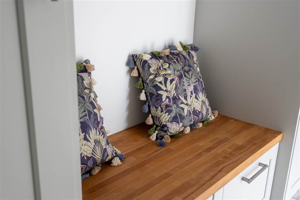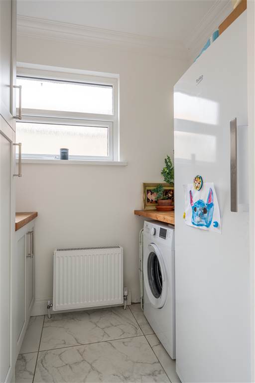 With access by sliding barn style door. A range of fitted units. Plumbed for washing machine. Space for full freezer. Spot lighting to ceiling. Coving to ceiling. Tiled flooring.