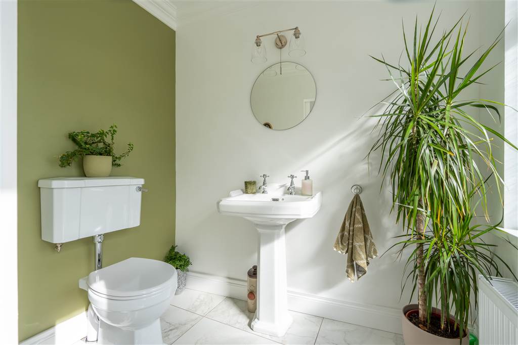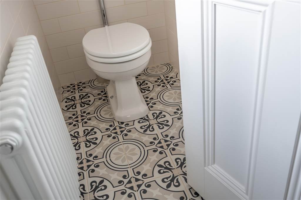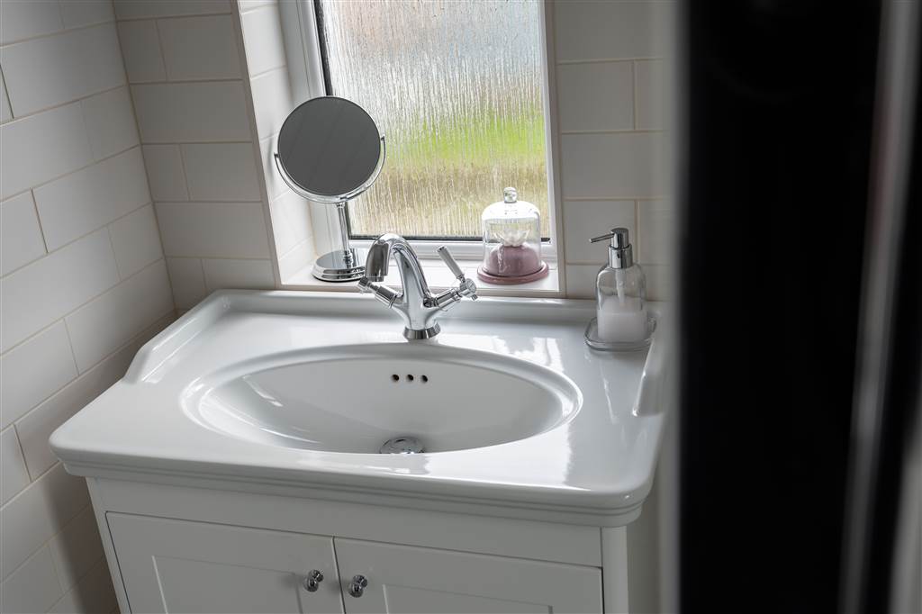 With access by sliding barn style door. LFWC and WHB. Wall light. Spot lighting to ceiling. Coving to ceiling. Tiled flooring.