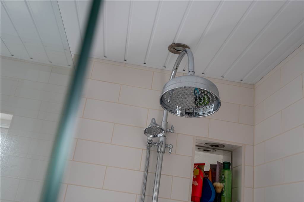 With WHB with built-in vanity unit and walk-in shower with waterfall shower head and hand-held shower head. Spot lighting to ceiling. Tiled walls. Tiled flooring.