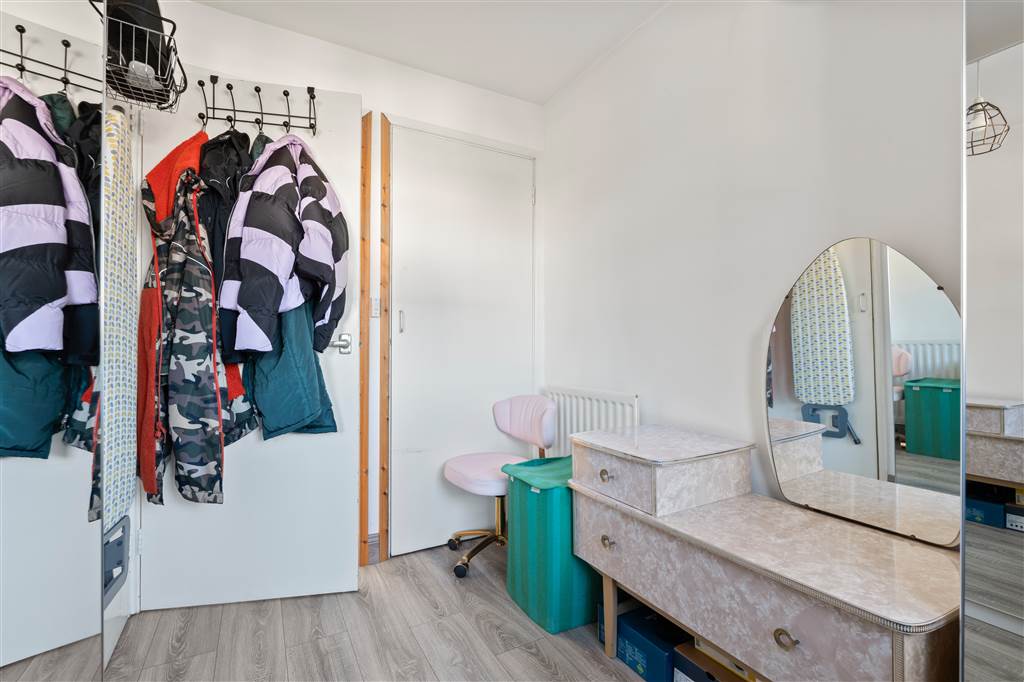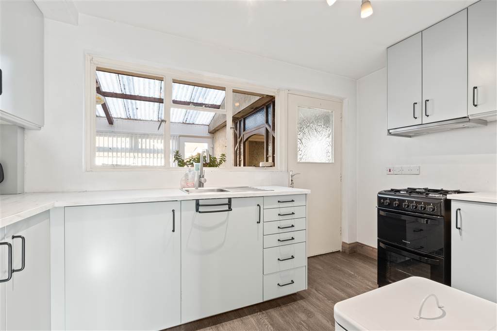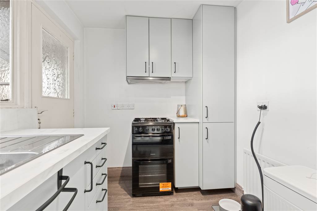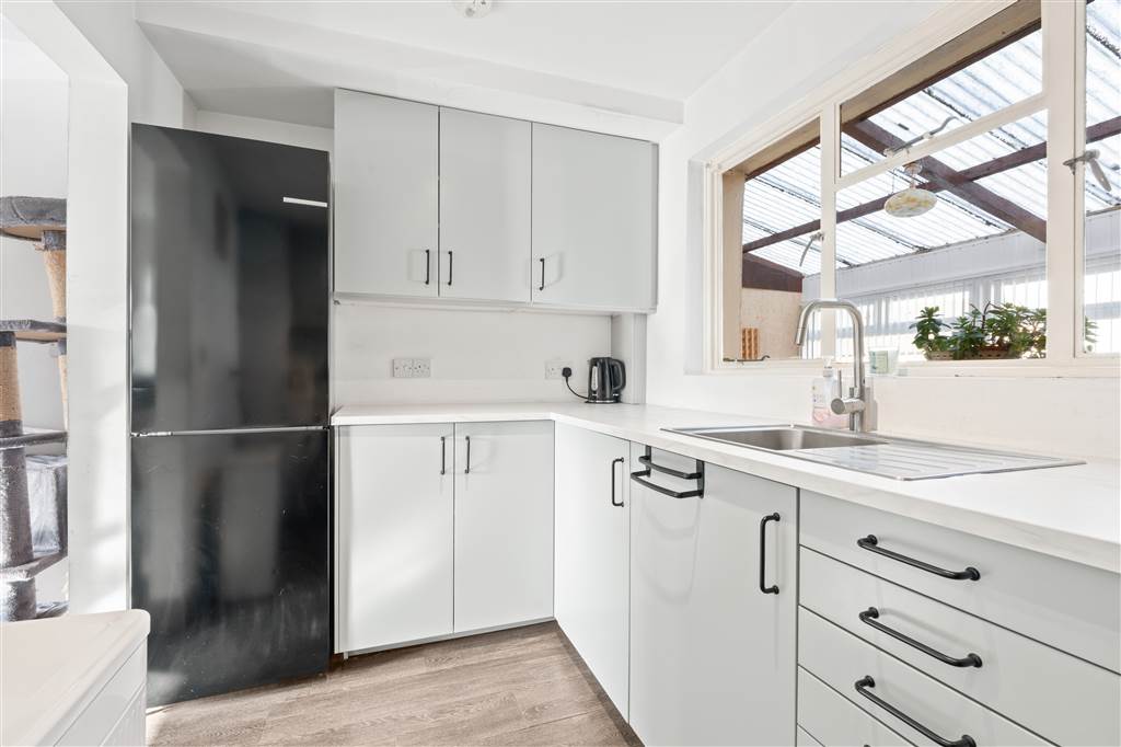 With a range of eye and low level fitted units, stainless-steel sink unit and drainer with stainless- steel mixer tap. Space for four ring gas hob and electric oven with extractor fan over. Space for fridge freezer. Storage drawers. Laminated wooden flooring. Hardwood door to rear hall.