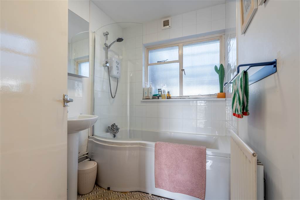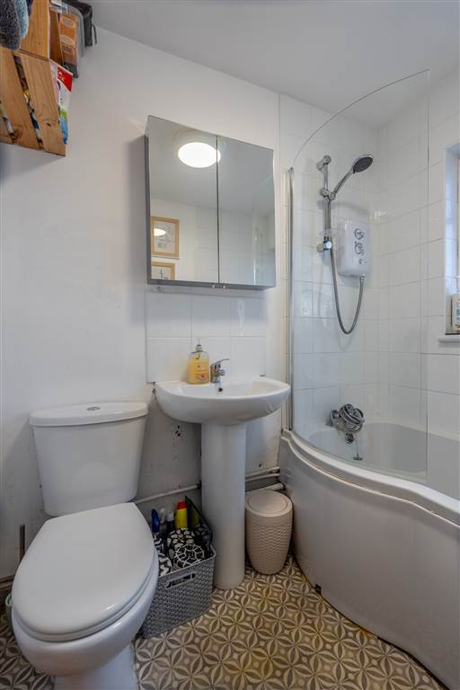 With 3-piece suite comprising LFWC, WHB and panelled bath with shower over. Splash back tiling.