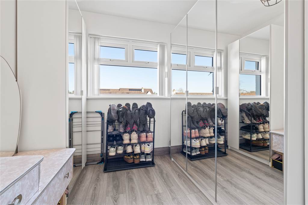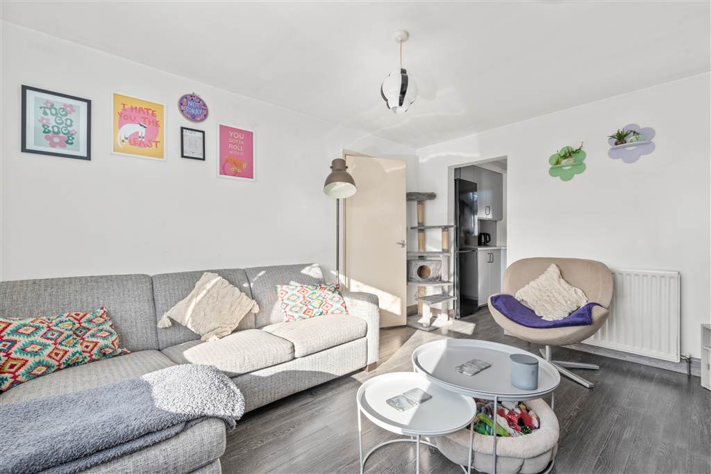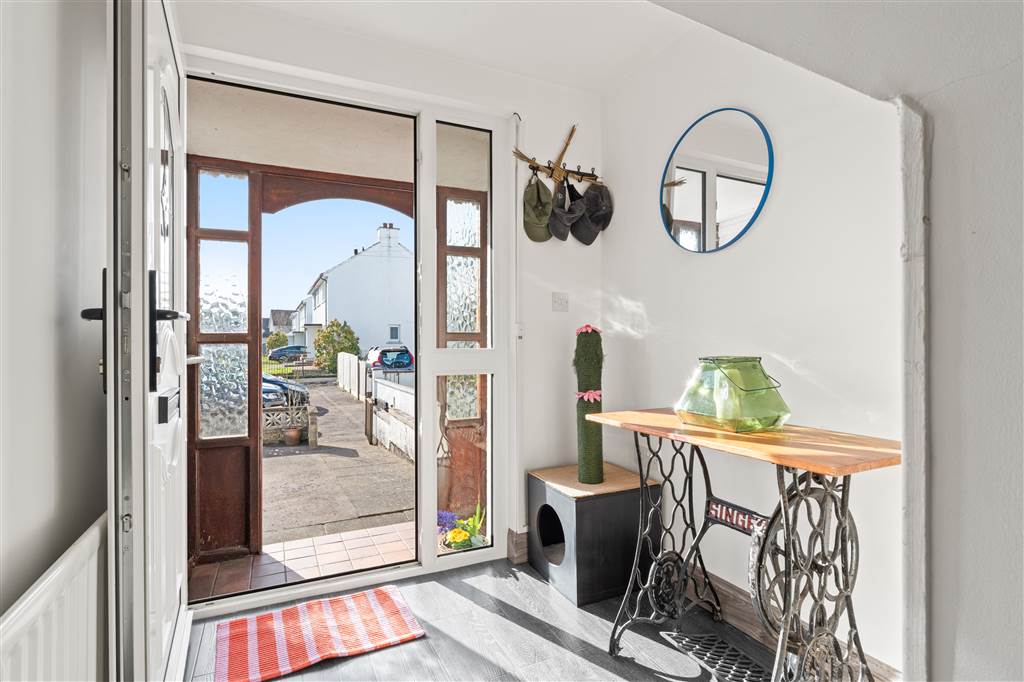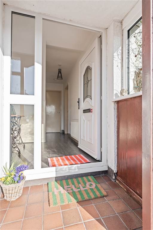 With PVC front door with decorative glazed pane and glazed side panes. Staircase to first floor. Understairs storage cupboard. Laminated wooden flooring.