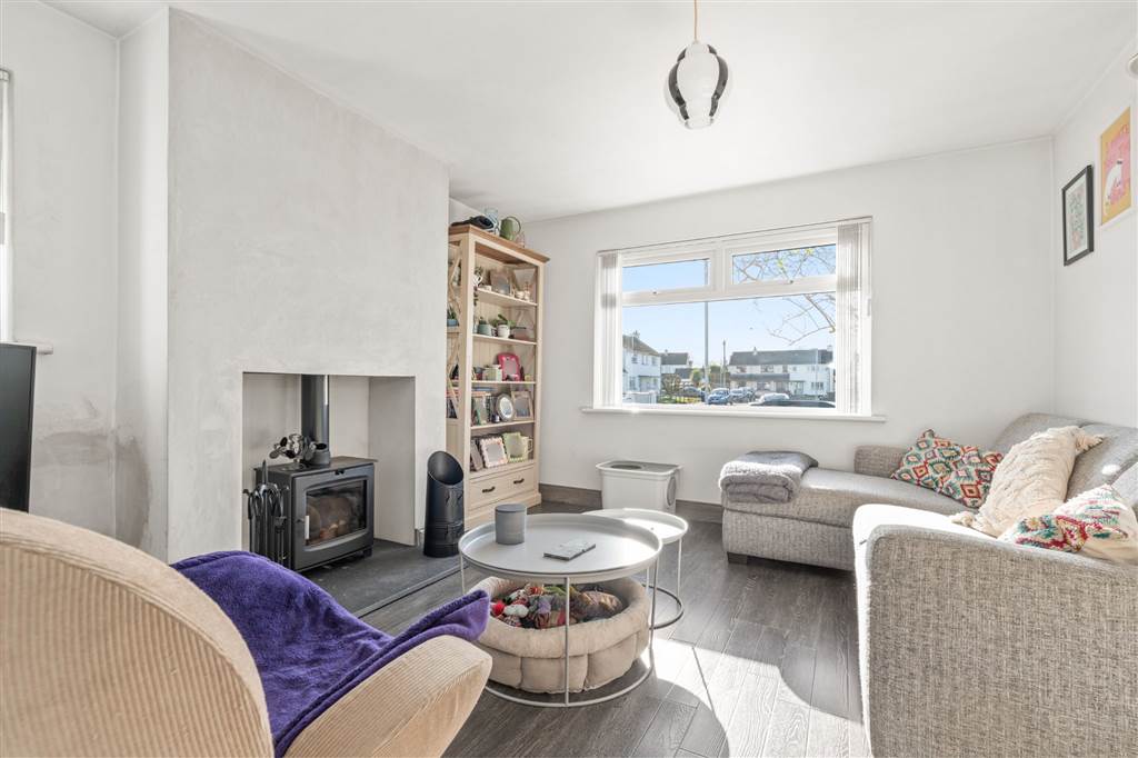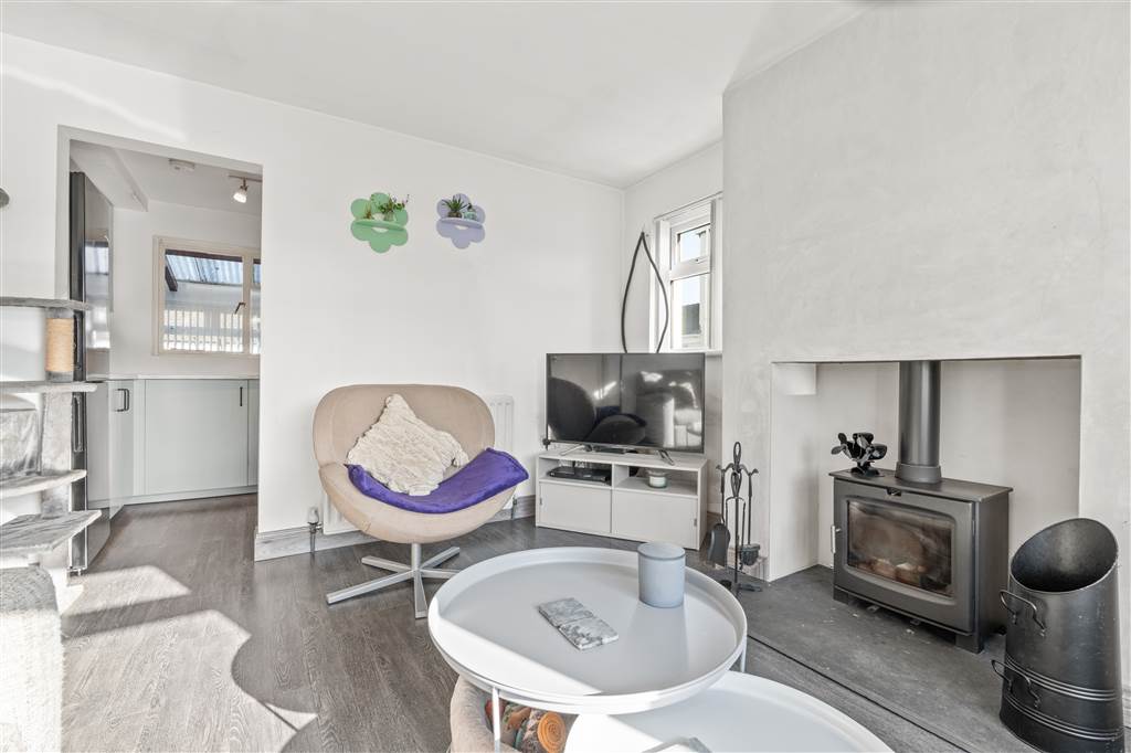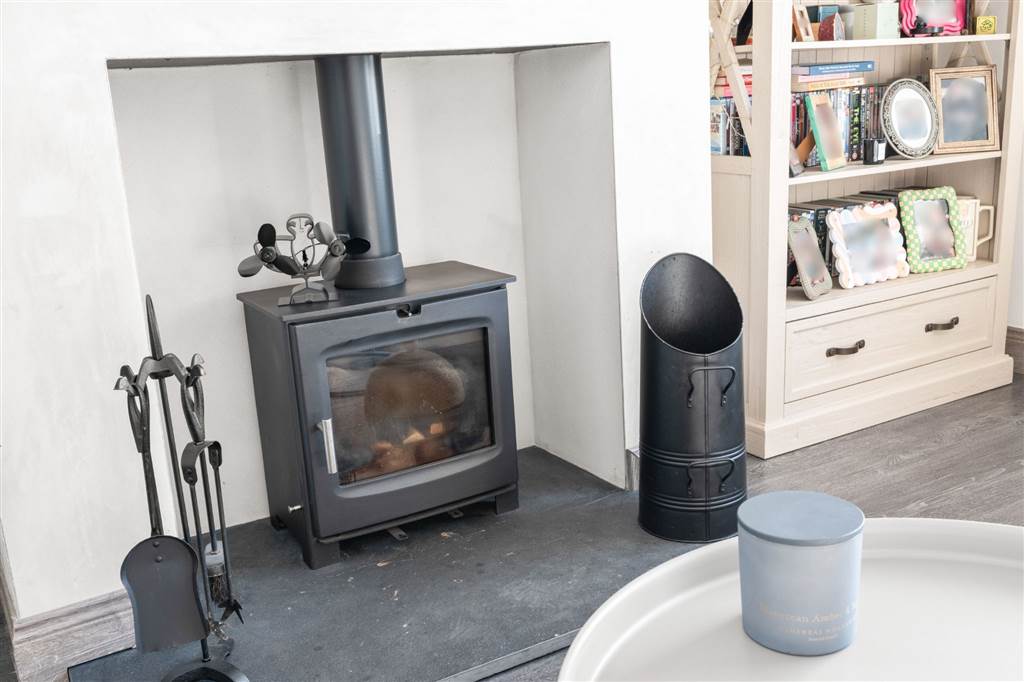 With multi-fuel burning stove to slate hearth. Laminated wooden flooring.