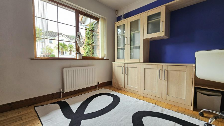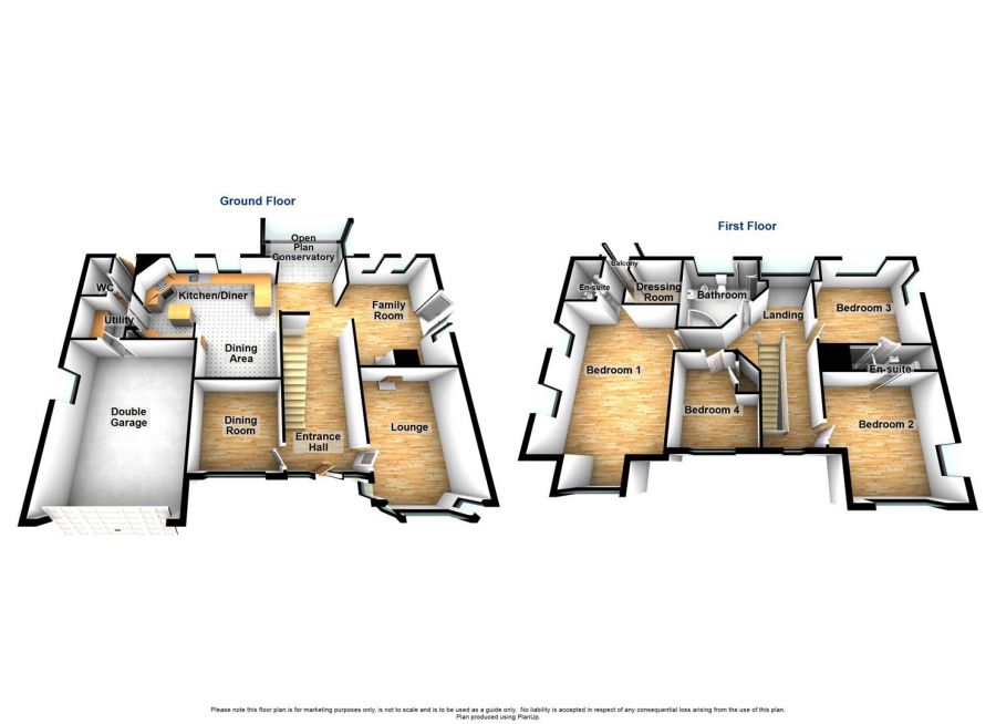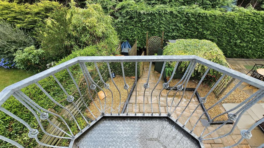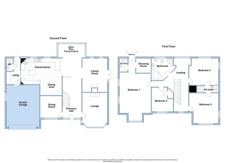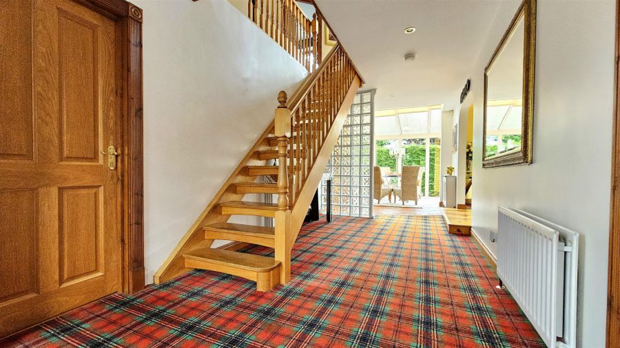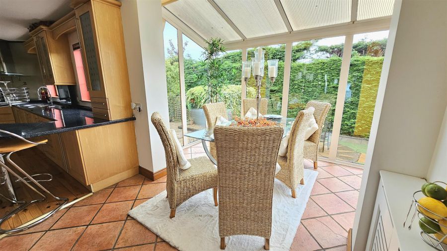 On the ground floor there are three reception rooms, an open-plan conservatory, and a lounge with a bay window and a double-sided fireplace is shared with the family room. The family room is open plan to the impressive entrance hall and opens onto a decked area in the rear garden through double doors. The kitchen includes a dining area, shaker-style units, a breakfast bar, an island, and built-in appliances. There is a five-piece family bathroom with a corner bath, with an additional downstairs WC, and a utility room.