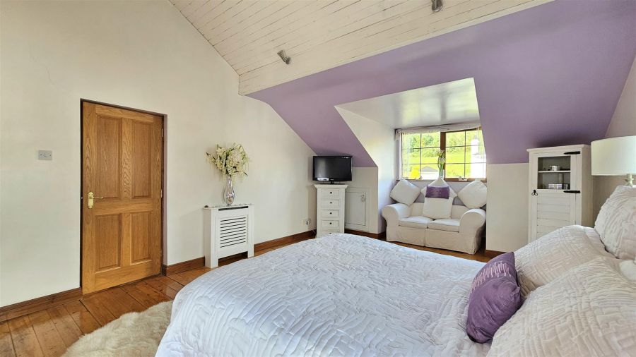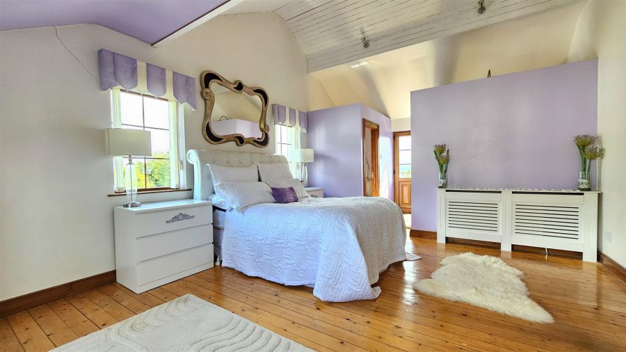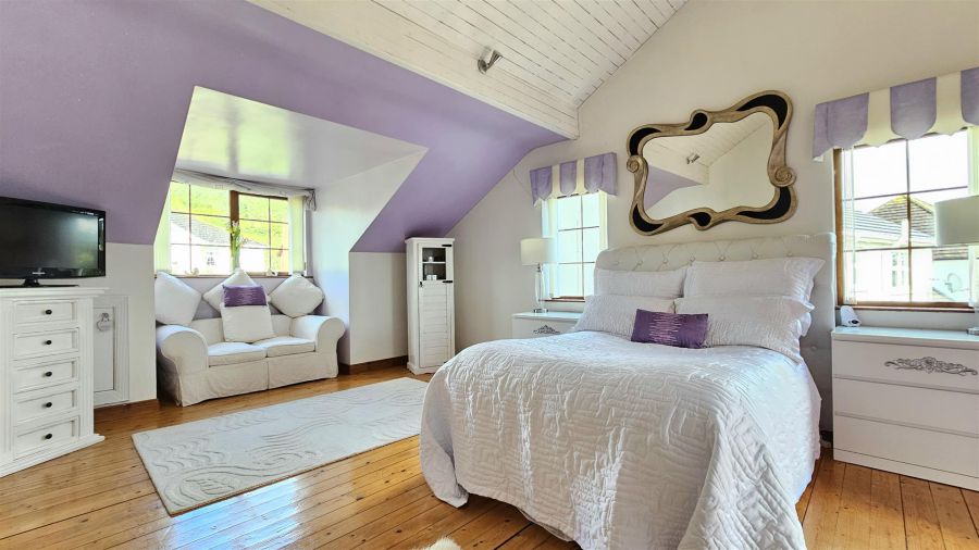 Master bedroom boasts a dressing room, vaulted ceilings and a balcony