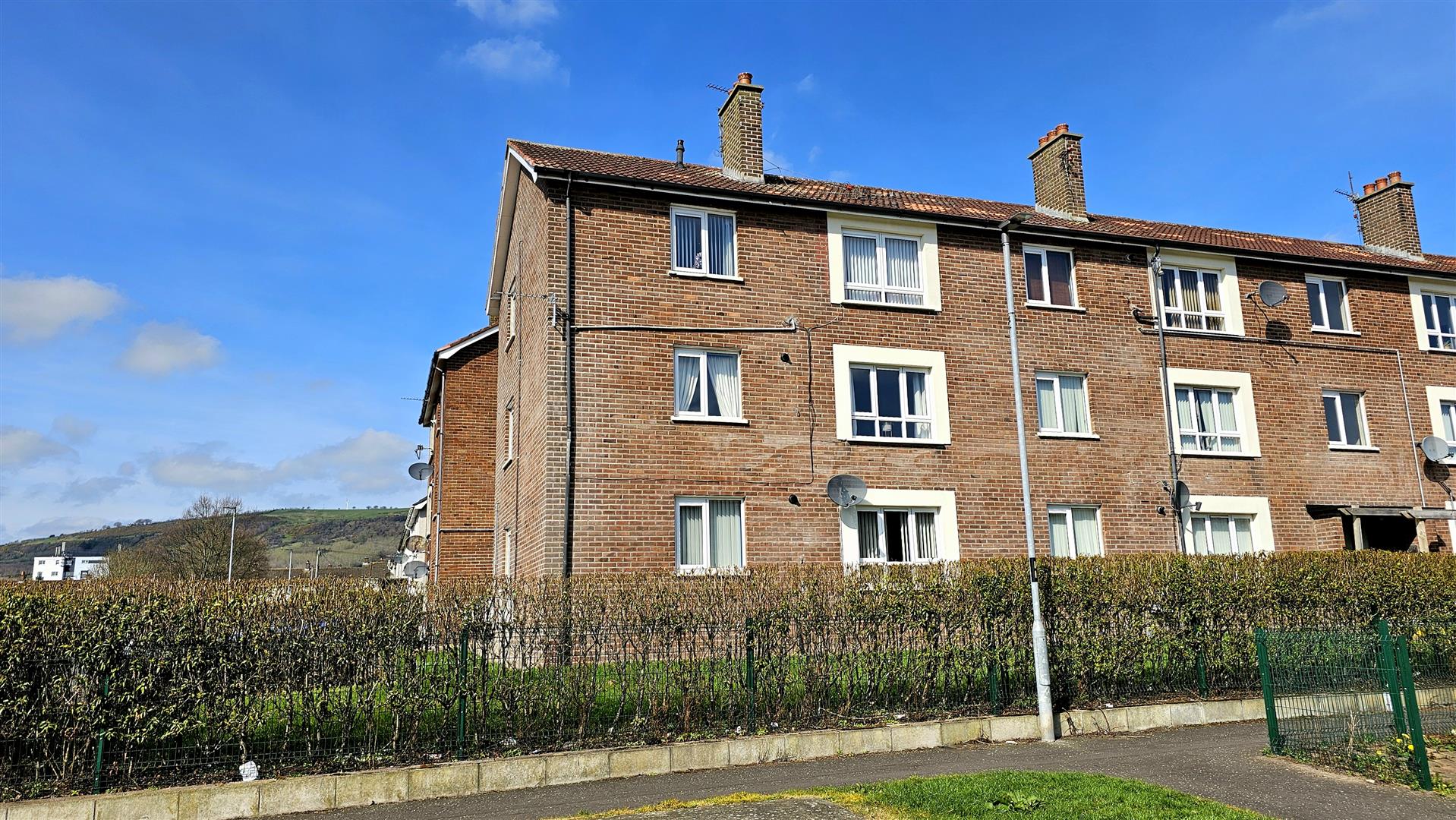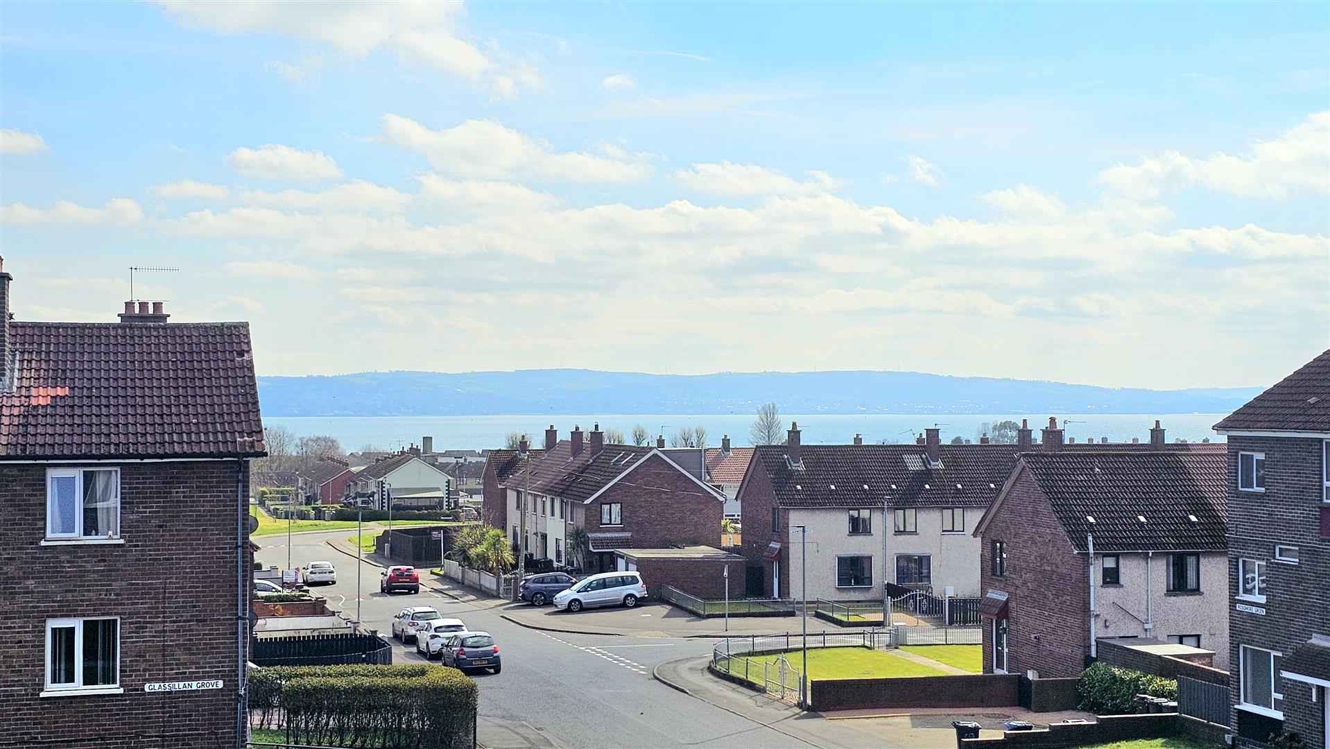 The property features two spacious double bedrooms and a bright 14'6 x 10'10 lounge with laminate wood flooring and views towards Belfast Lough, the separate kitchen boasts an excellent range of contemporary units and is further complimented by an integrated oven, hob, and extractor fan, while also enjoying a view towards Knockagh Monument. The modern shower room is fitted with a modern white suite with PVC tile-effect panelled walls for easy maintenance and a wash hand basin set on a vanity unit. Additional features include oak-style internal doors, double-glazed windows, and a gas heating system.