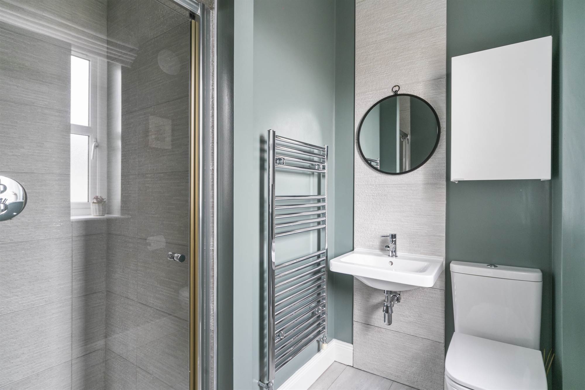 Fully tiled corner shower cubicle with rainhead attachment. Low flush WC. Pedestal wash hand basin. Ceramic tiled floor. Chrome heated towel radiator. Extractor fan.