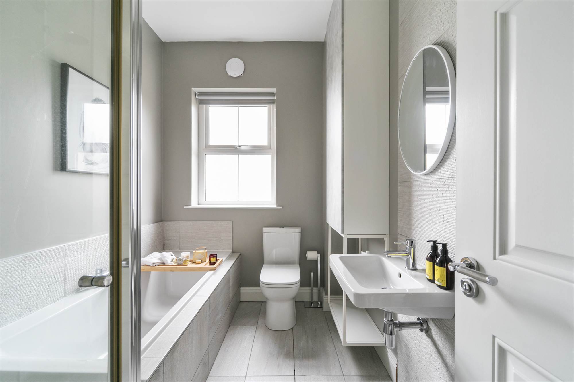 Bath with telephone shower. Fully tiled shower cubicle. Low flush WC. Pedestal wash hand basin. Extractor fan. Low voltage spotlighting.