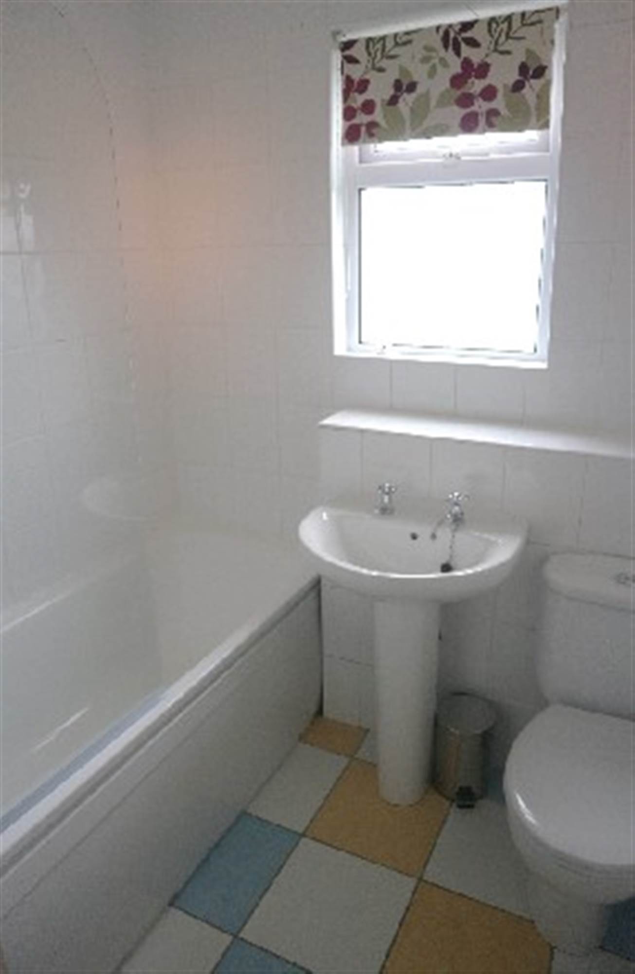 White suite comprising of panelled bath with mixer taps and telephone hand shower. Low flush WC. Pedestal wash hand basin.