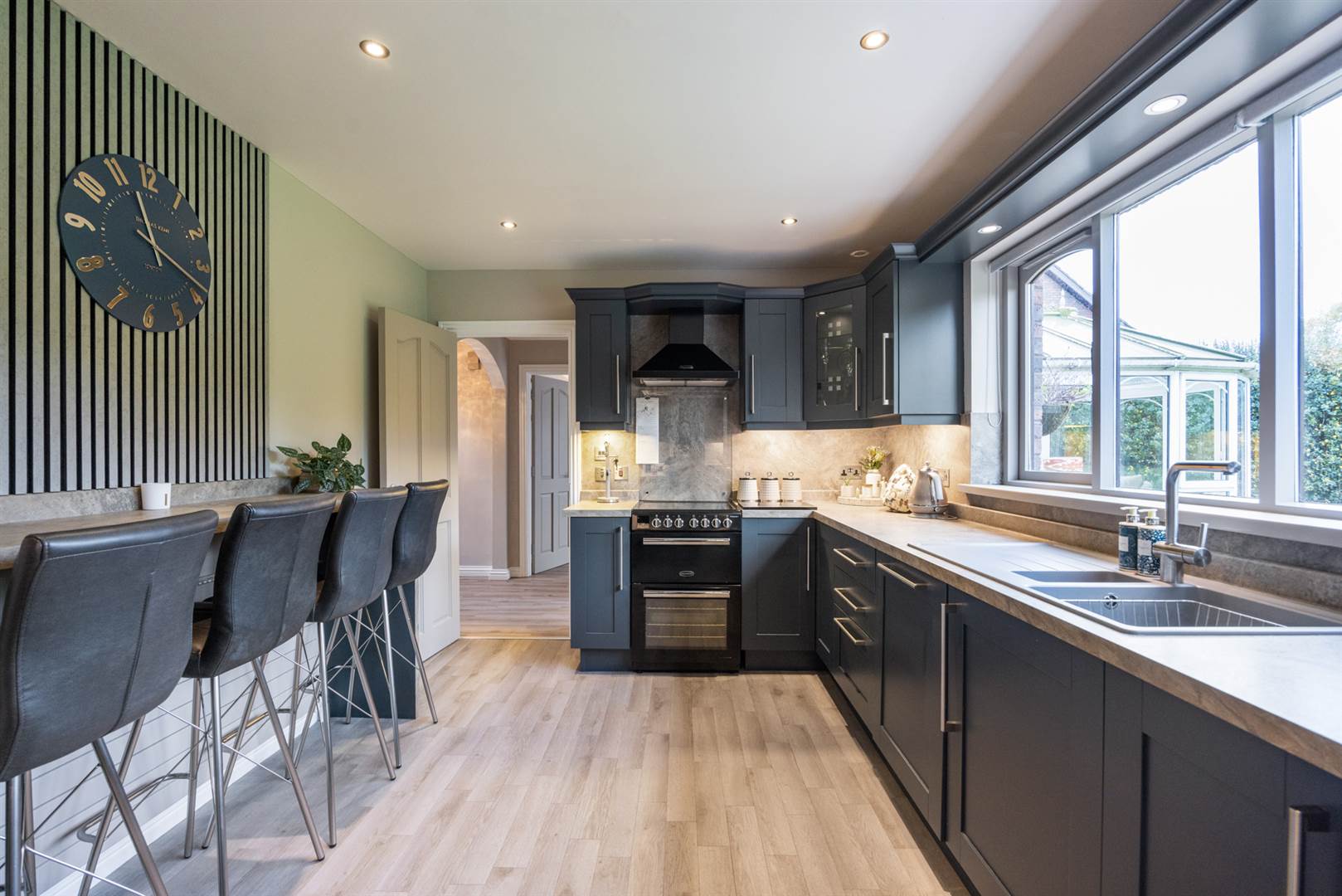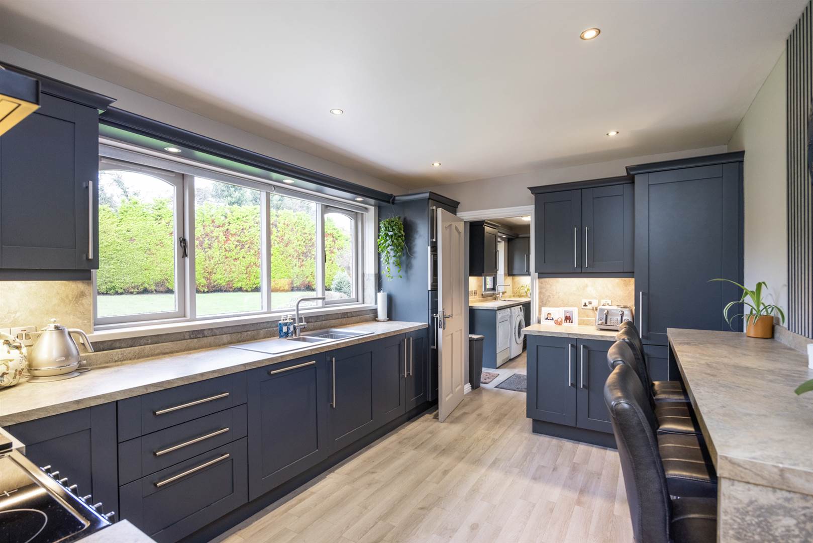 Shaker style kitchen with granite effect worktops, integrated appliances and breakfast bar area