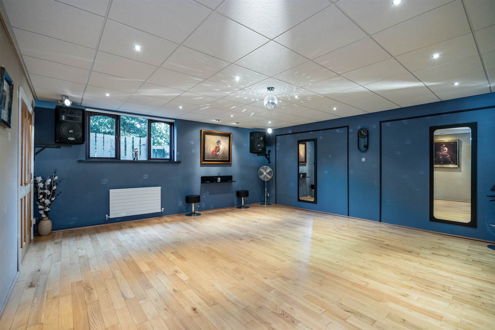 Solid oak spring floor as used for dance venues, concealed twin up and over garage doors, boiler house housing oil fired central heating boiler, suspended ceiling, light and power (currently the garage is being used as a dance studio but can easily be changed back to a double garage)