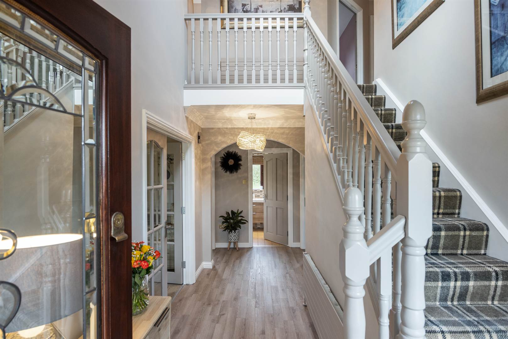 Staircase leading to first floor, painted spindles and handrails, limed oak laminate flooring, cloakroom cupboard.