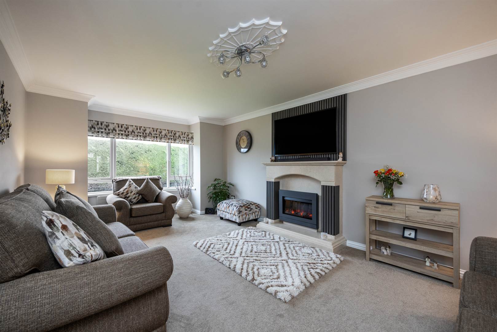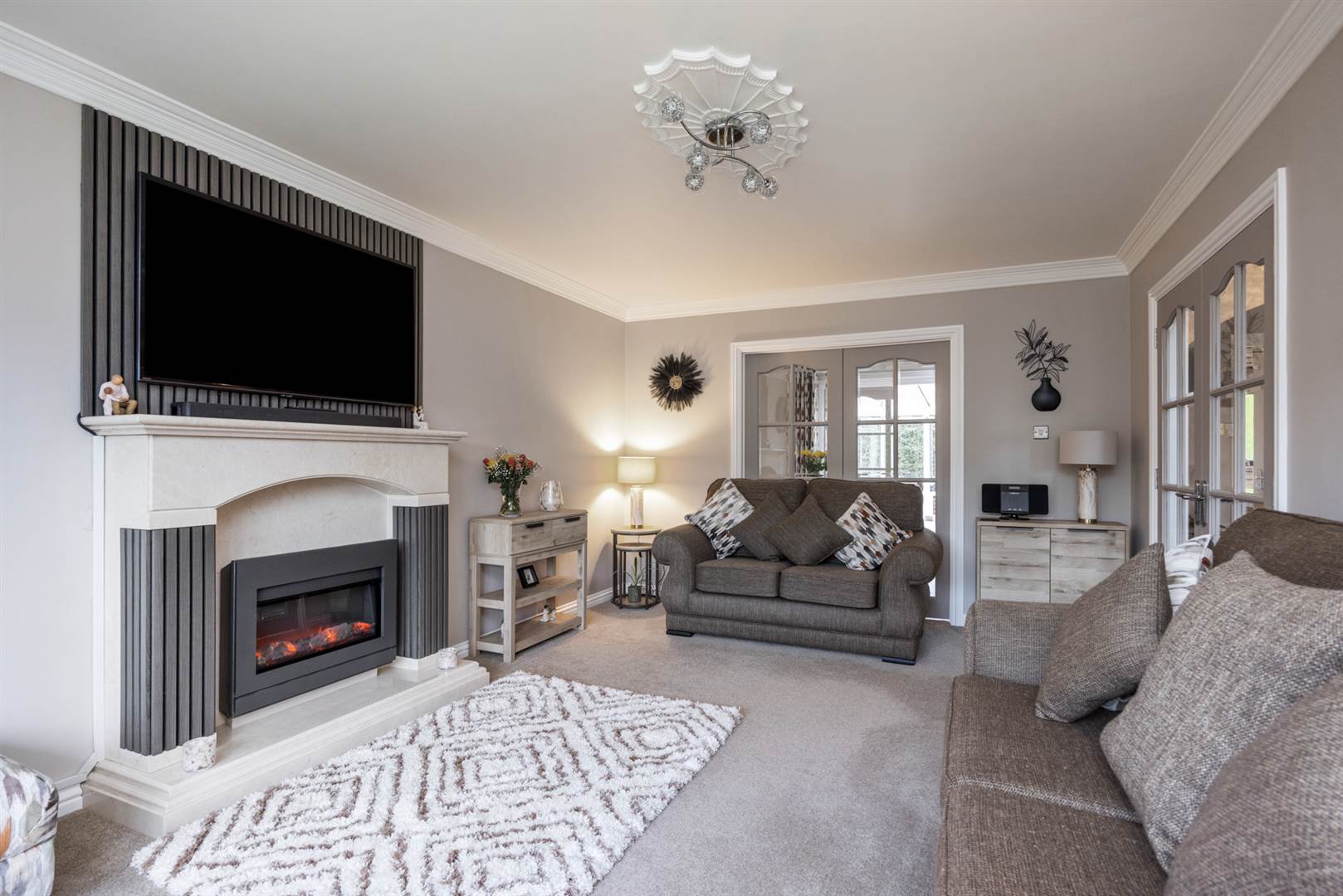 Stone fireplace and hearth with electric glass fronted fire, low voltage lighting, double glazed doors to hallway and dining room.