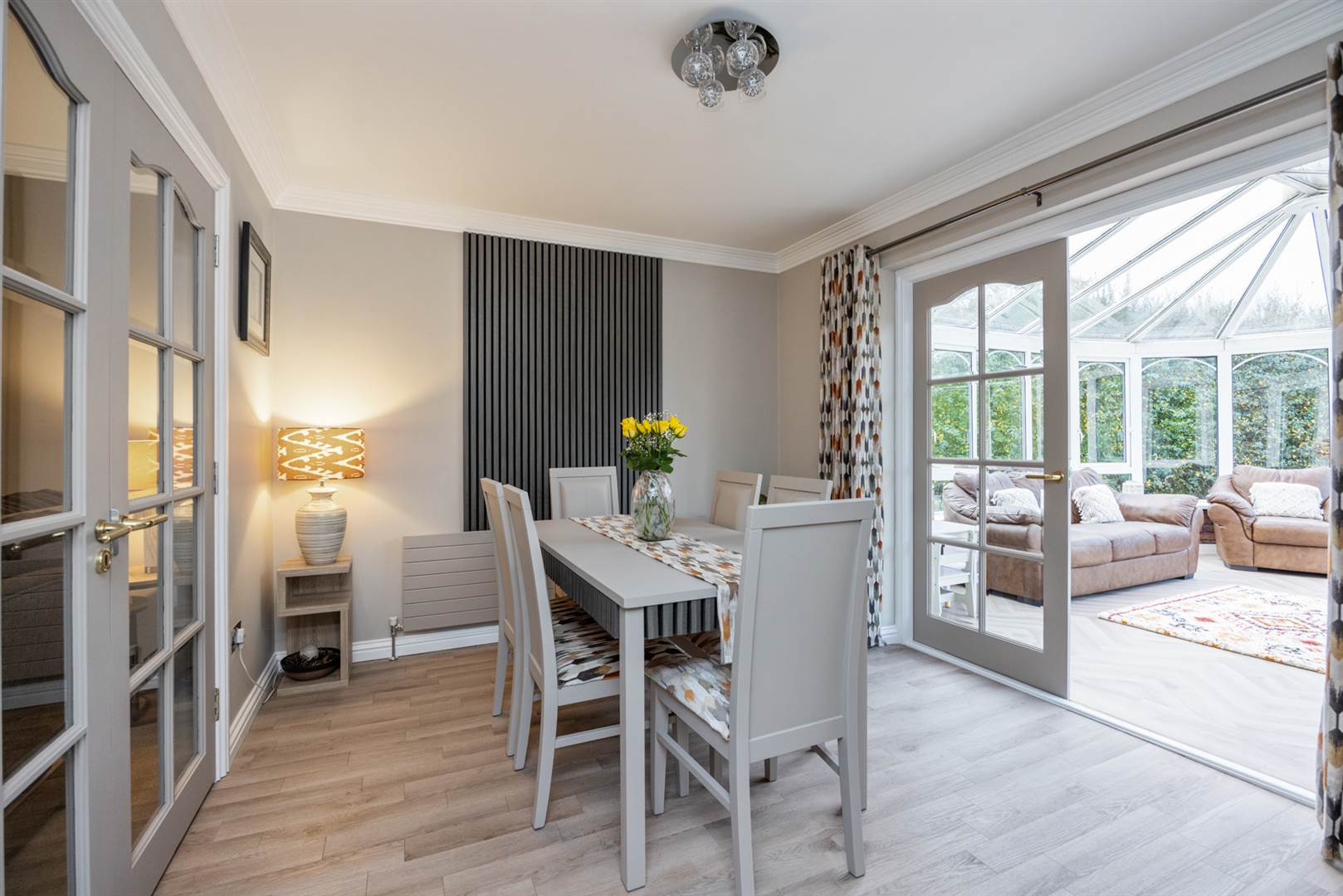 Engineered floor in a limed oak finish, double door to patio area.