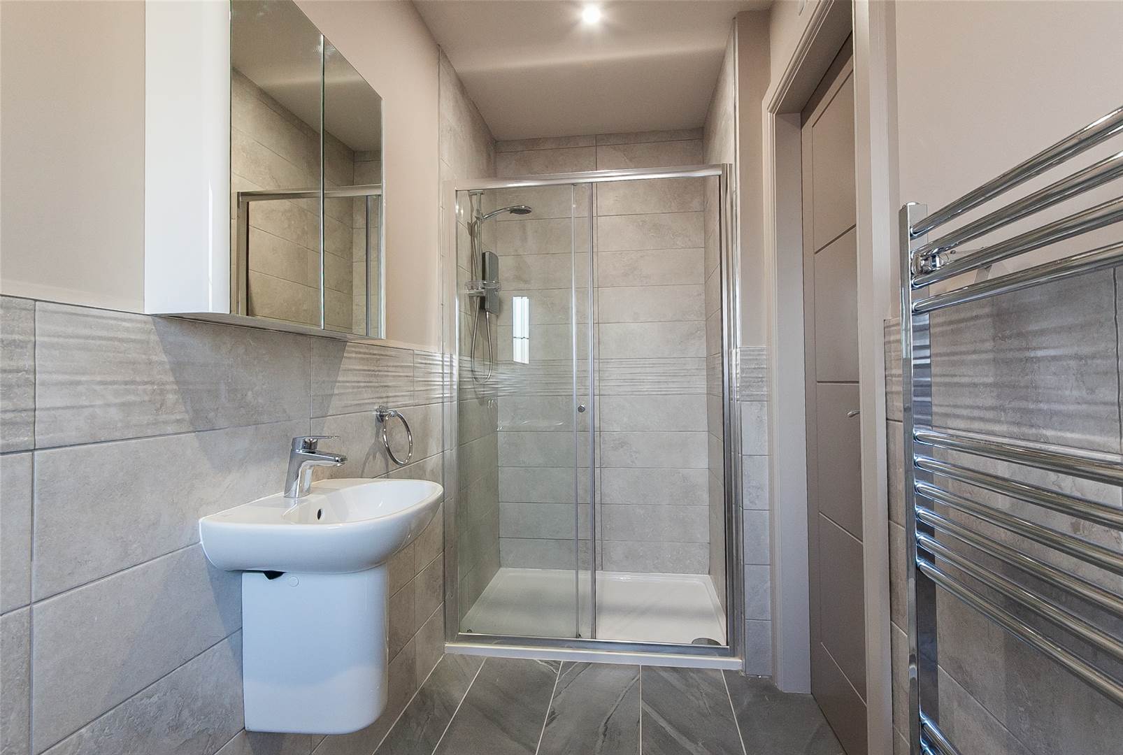 White suite comprising double shower cubicle with electric shower, semi pedestal wash hand basin with mixer tap, low flush wc, part tiled walls, ceramic tiled floor, wall hung mirrored medicine cabinet, chrome heated towel radiator, extractor fan, low voltage lighting.
