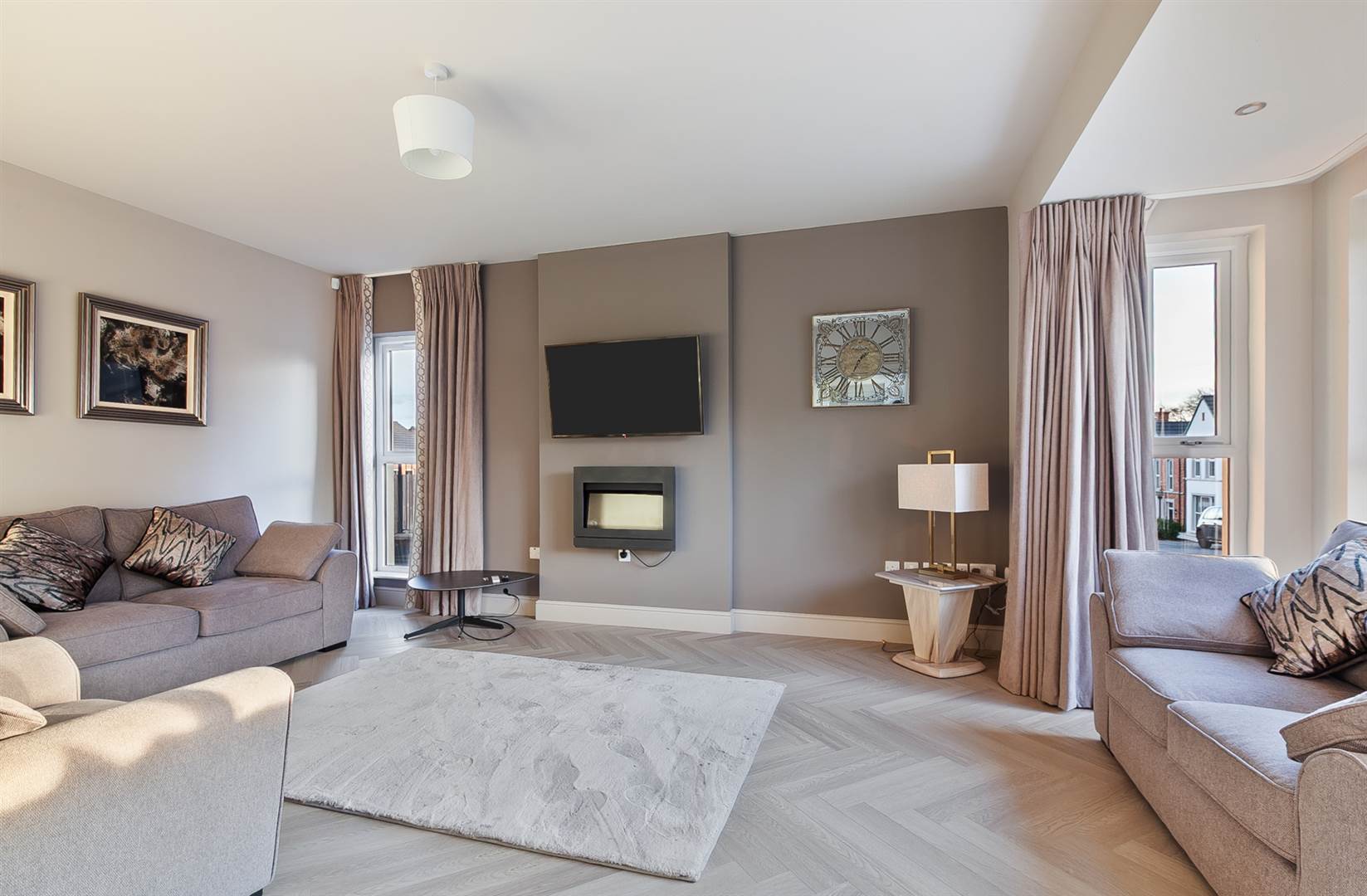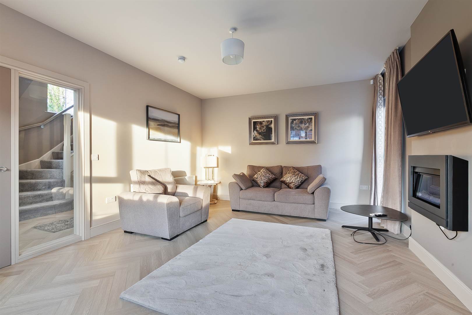 Drawing room with wall-mounted feature electric fire and herringbone flooring