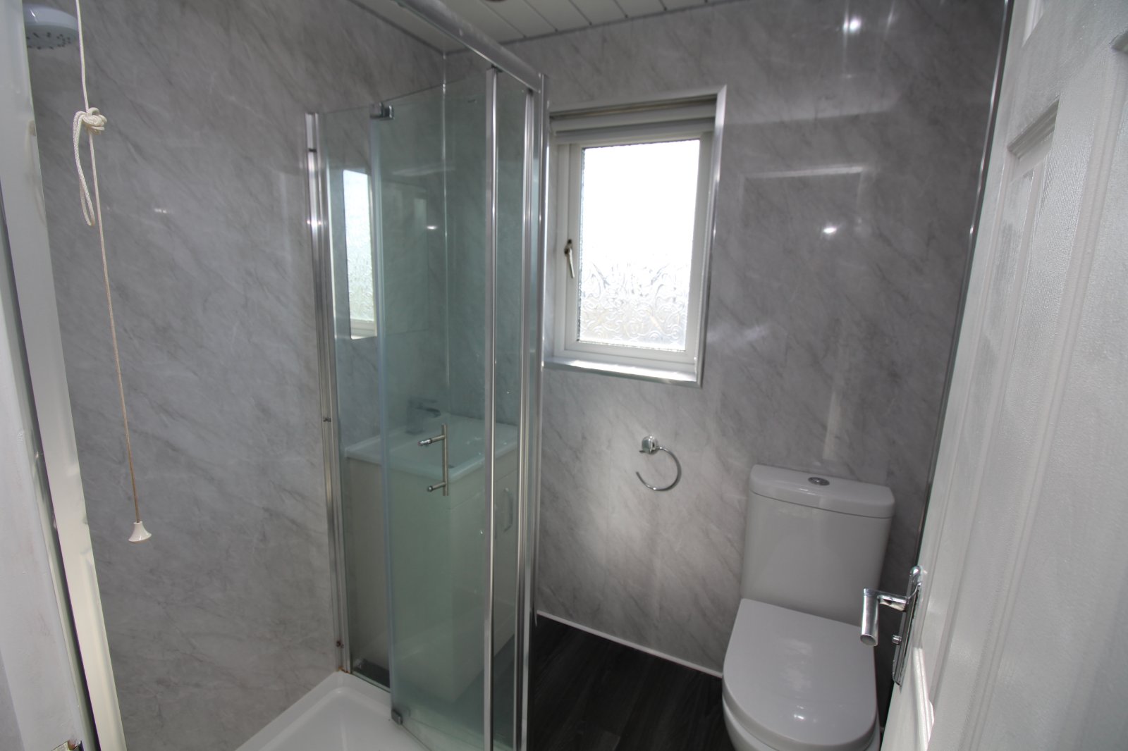 White suite comrising large shower cubicle with electric shower, vanity unit and low flush wc. Full PVC panelled walls. PVC panelled ceiling with spot lights. Laminate wood flooring.
