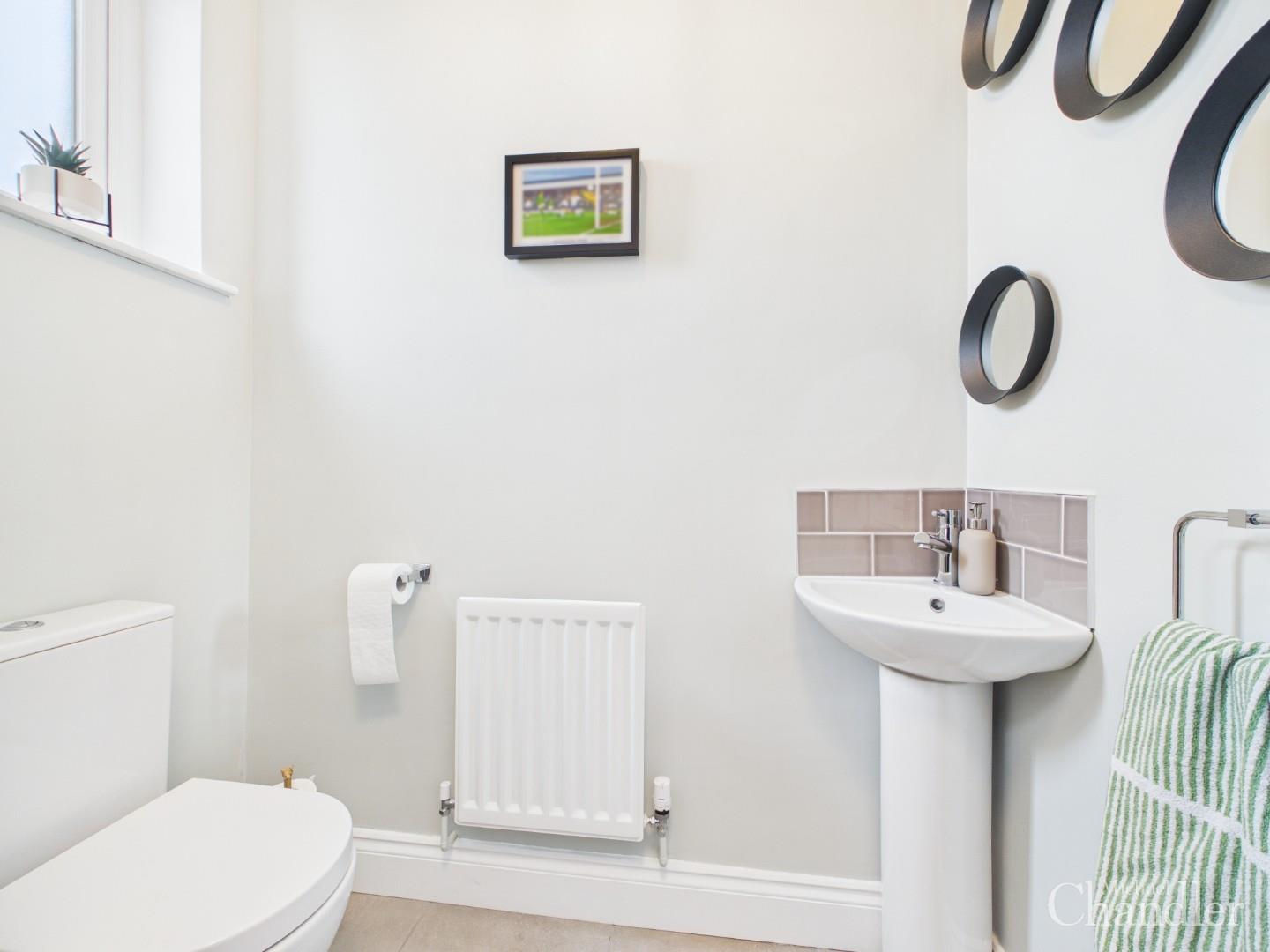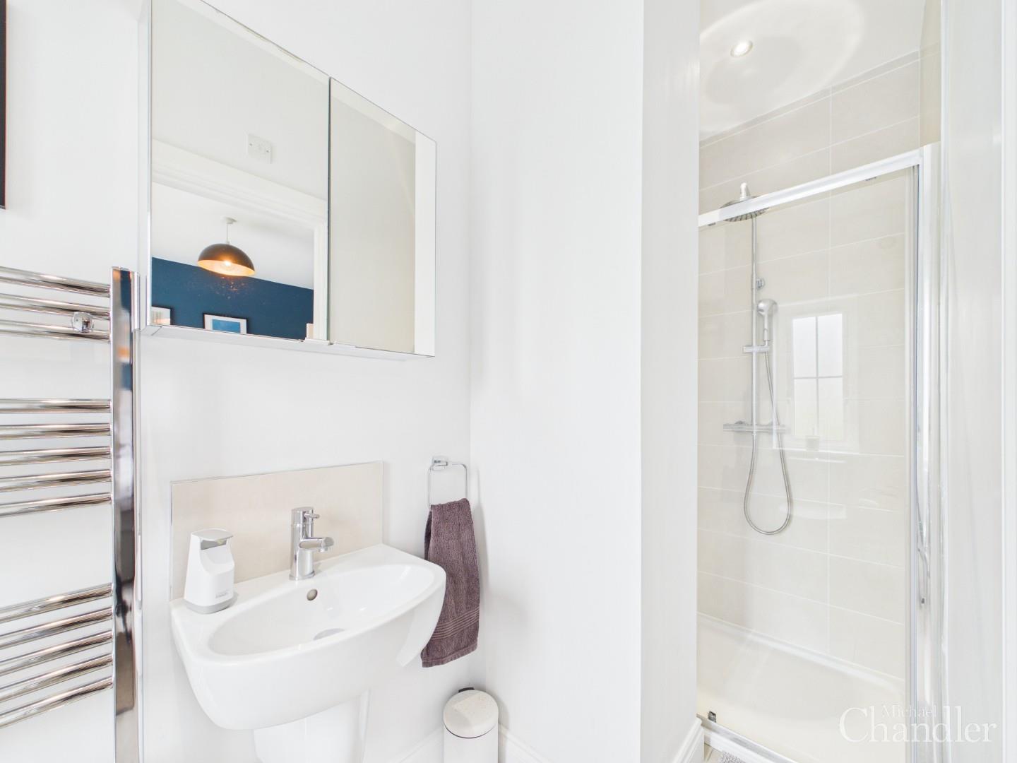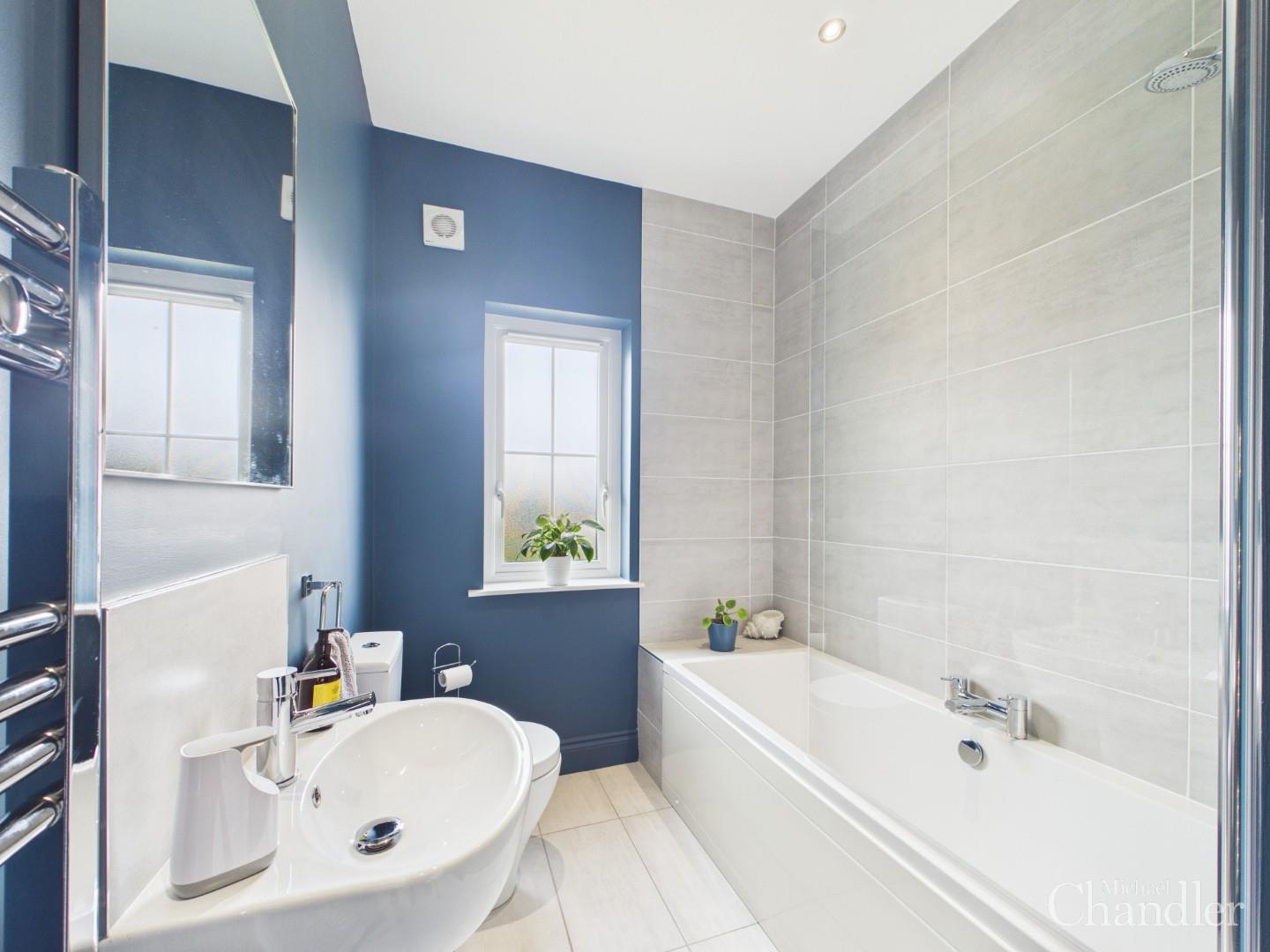 Upstairs, the property continues to impress. The principal bedroom provides a private retreat, complete with a luxurious en-suite shower room. Two further well-proportioned bedrooms offer flexibility for family living, guests, or a home office, all complemented by a stylish main bathroom featuring a classic white three-piece suite.