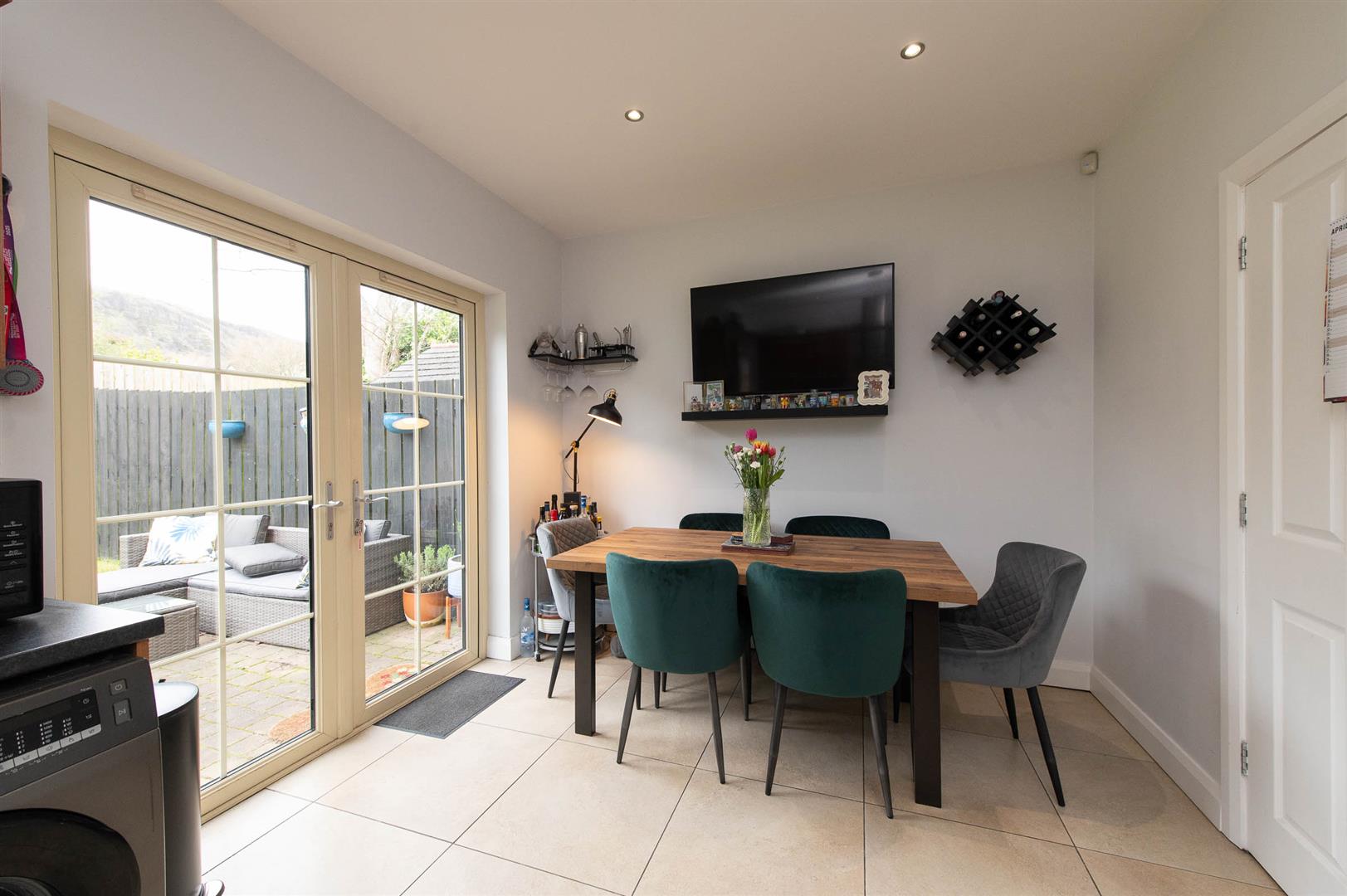 Casual dining area with polished tiled flooring and french doors to garden, downlighters.