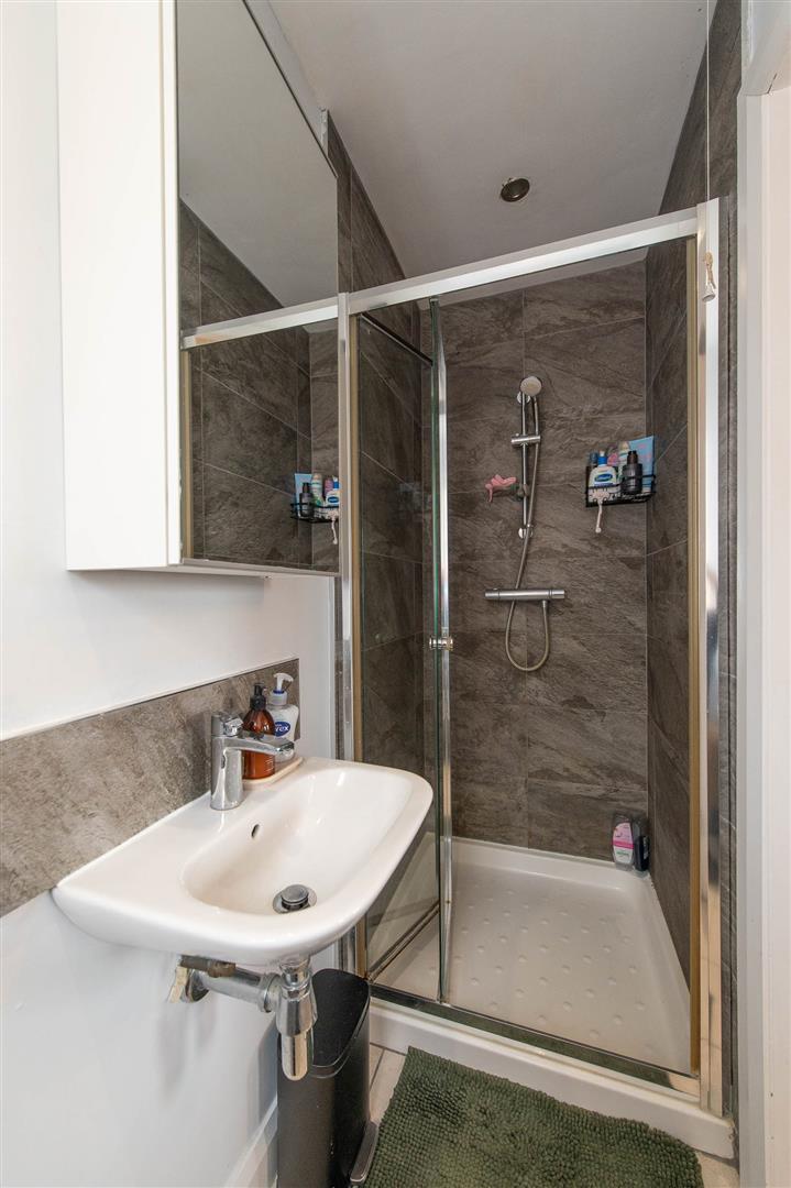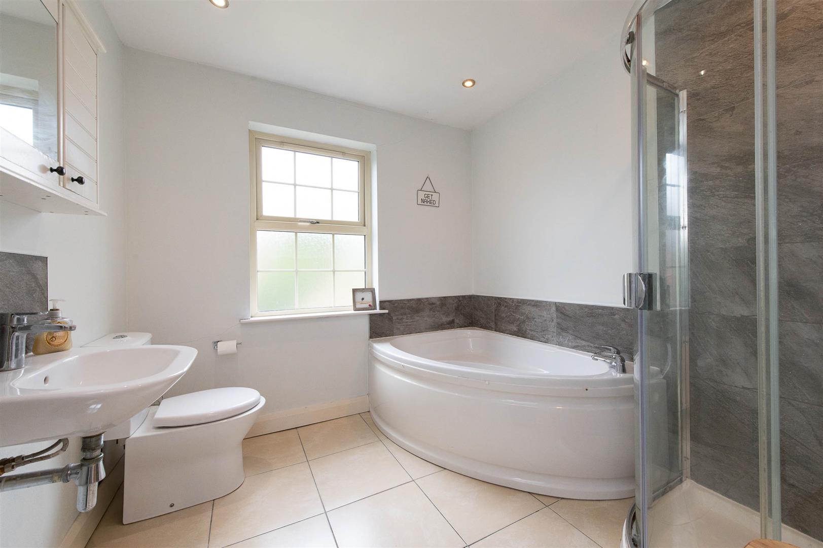 Ensuite with low flush w.c, wall hung wash hand basin, glazed shower unit with controlled shower, tiling, ceramic tiled floor, heated towel rail.