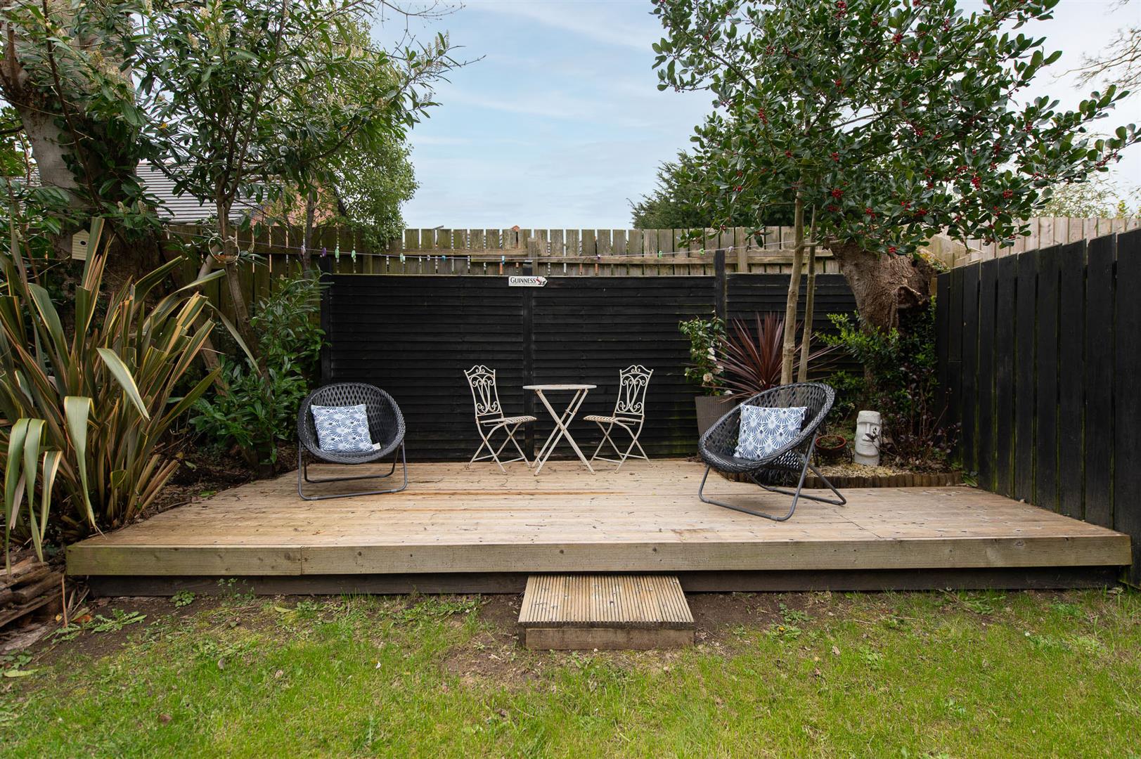 Rear garden laid in lawn, paved patio and raised decked area, outside light