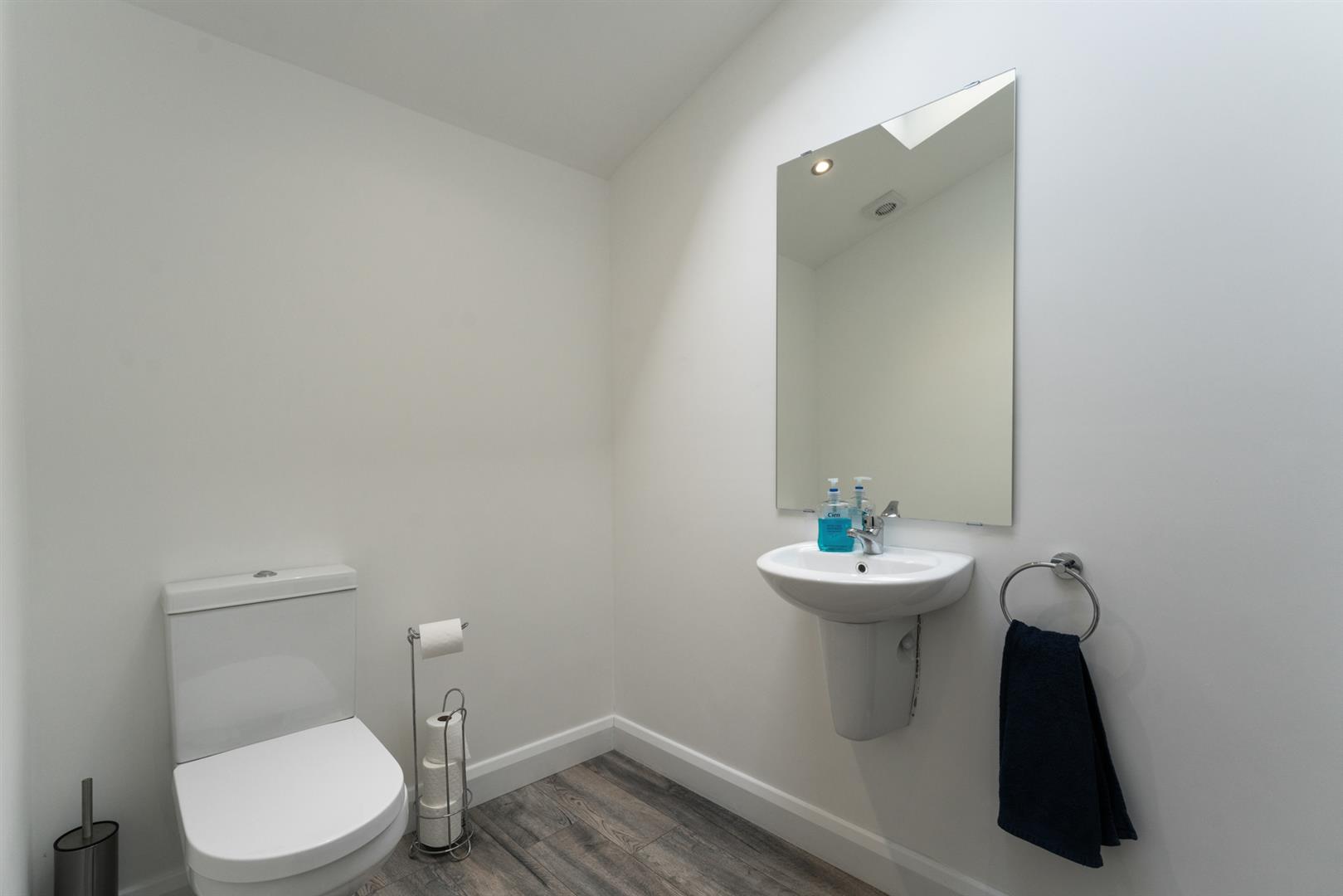 White suite comprising wall mounted wash hand basin with mixer tap, low flush w/c, extractor fan, recessed spotlights, wood laminate floor, velux style window.