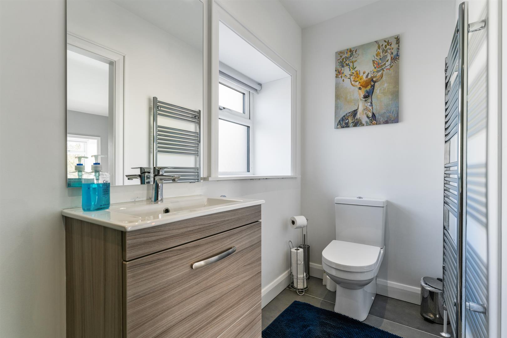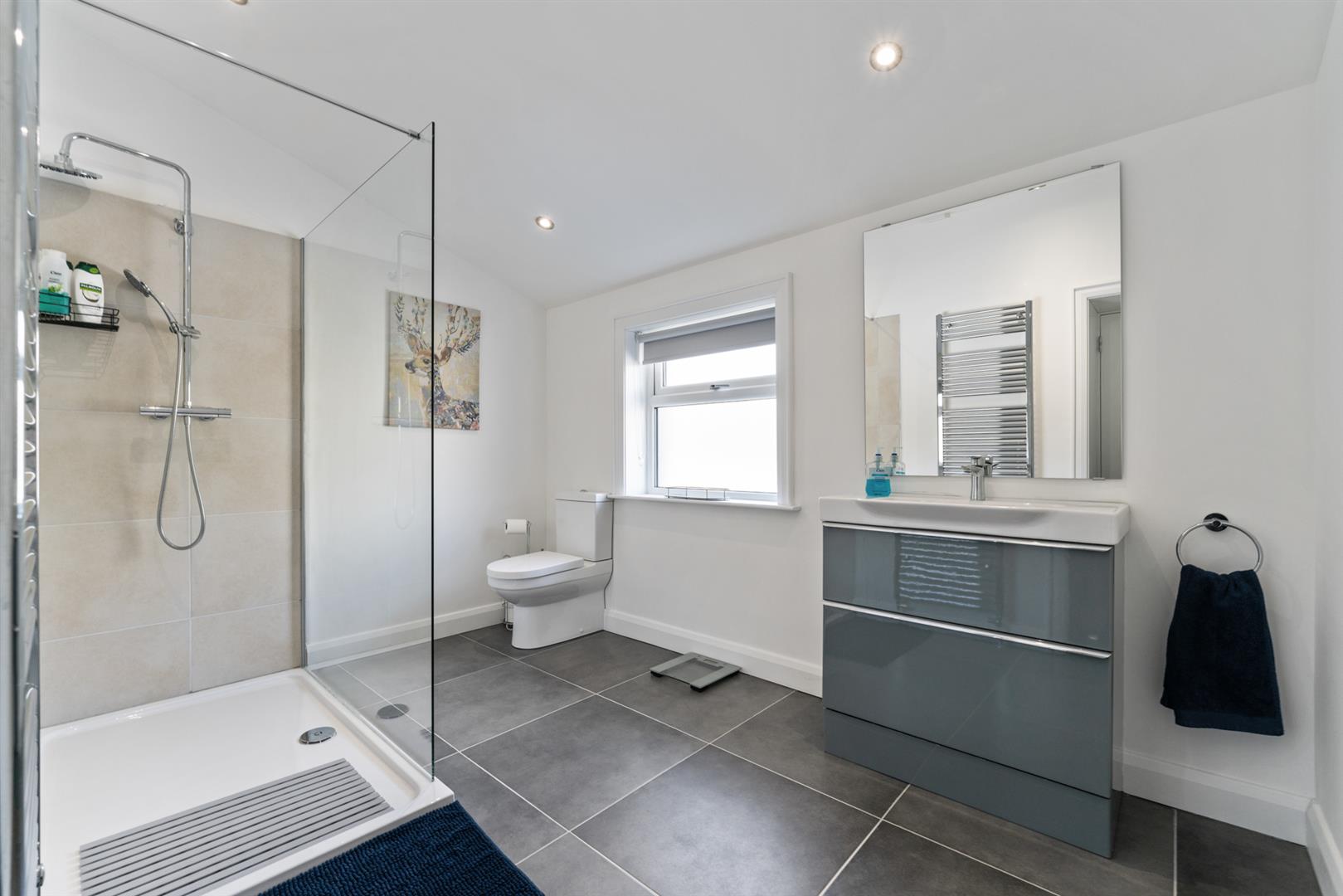 White suite comprising walk in shower, wall mounted overhead shower, sliding glass door, vanity unit with mixer tap and storage, low flush w/c, heated towel rail, recessed spotlights, tiled floor, part tiled walls, extractor fan.