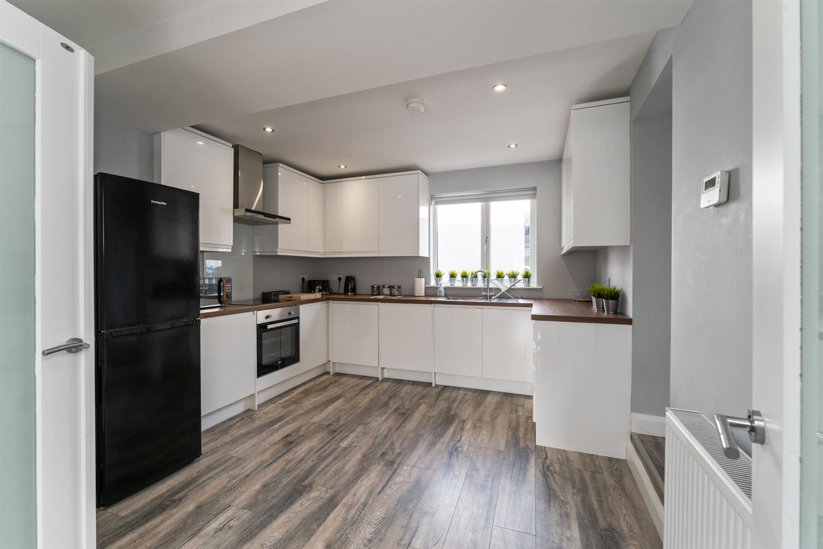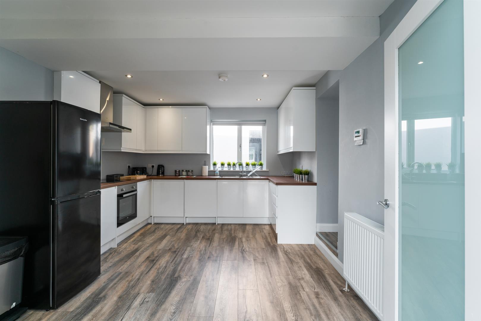 Range of high and low level units, laminate work surfaces, single stainless steel sink with mixer tap and drainer, integrated washing machine, dishwasher, oven, four ring electric hob, stainless steel extractor hood, space for fridge/freezer, recessed spotlights, wood laminate floor and built in storage.