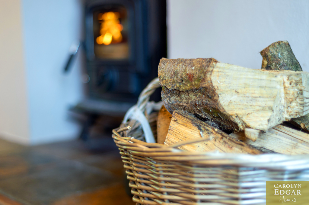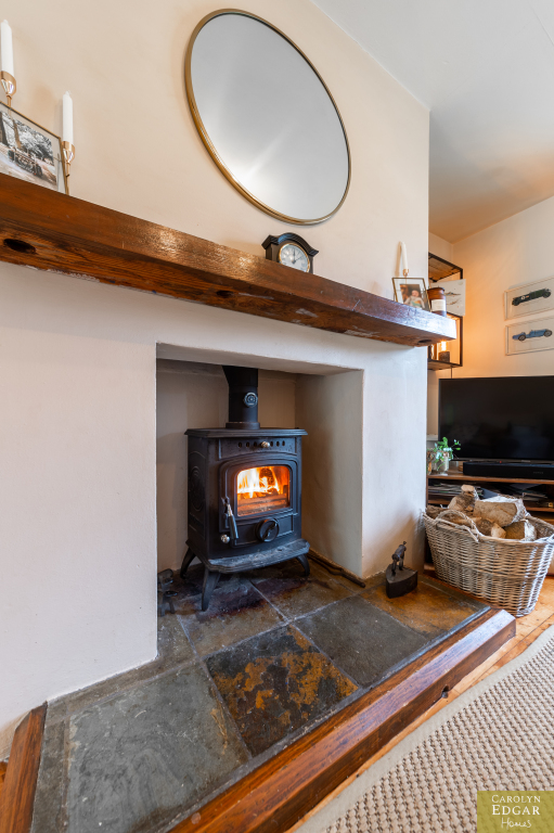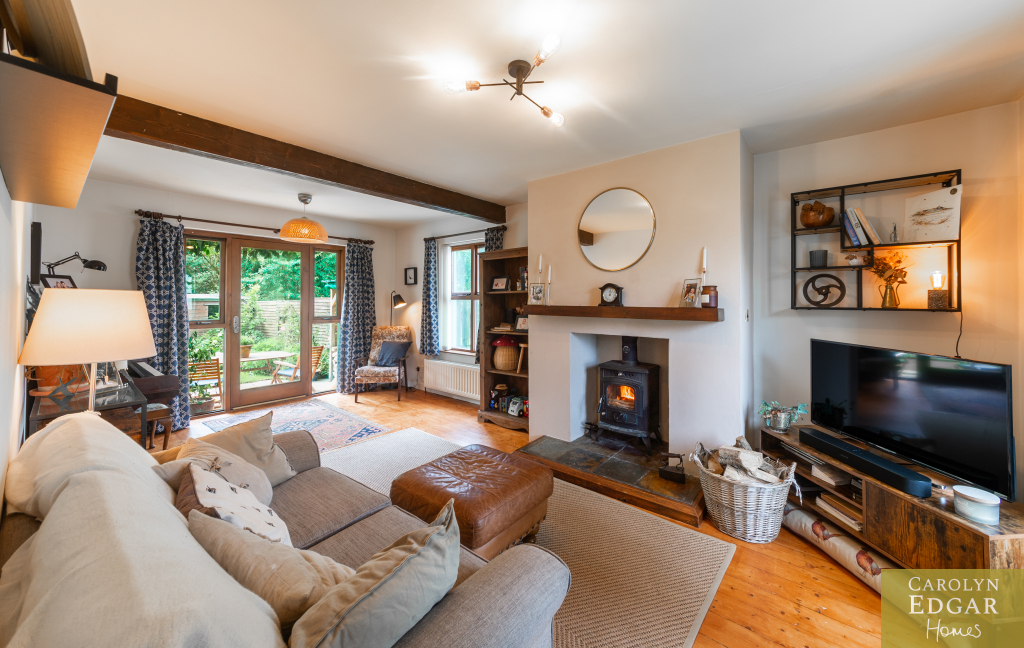 Open Plan Loung with Wood Burning Stove and Doors to Sun Terrace