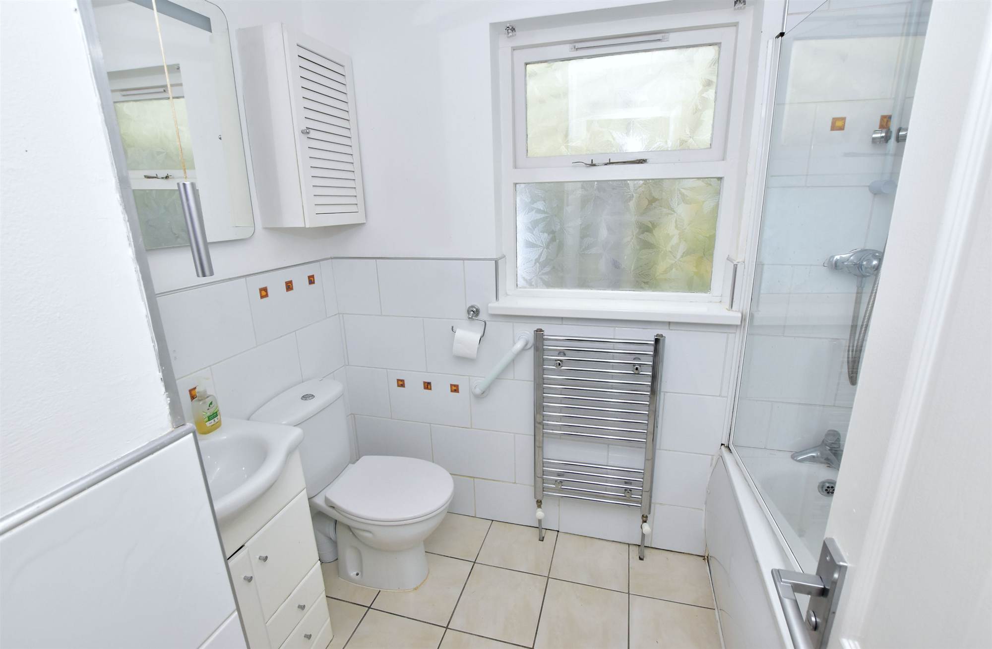 White bathroom suite with ceramic wall and floor tiling.